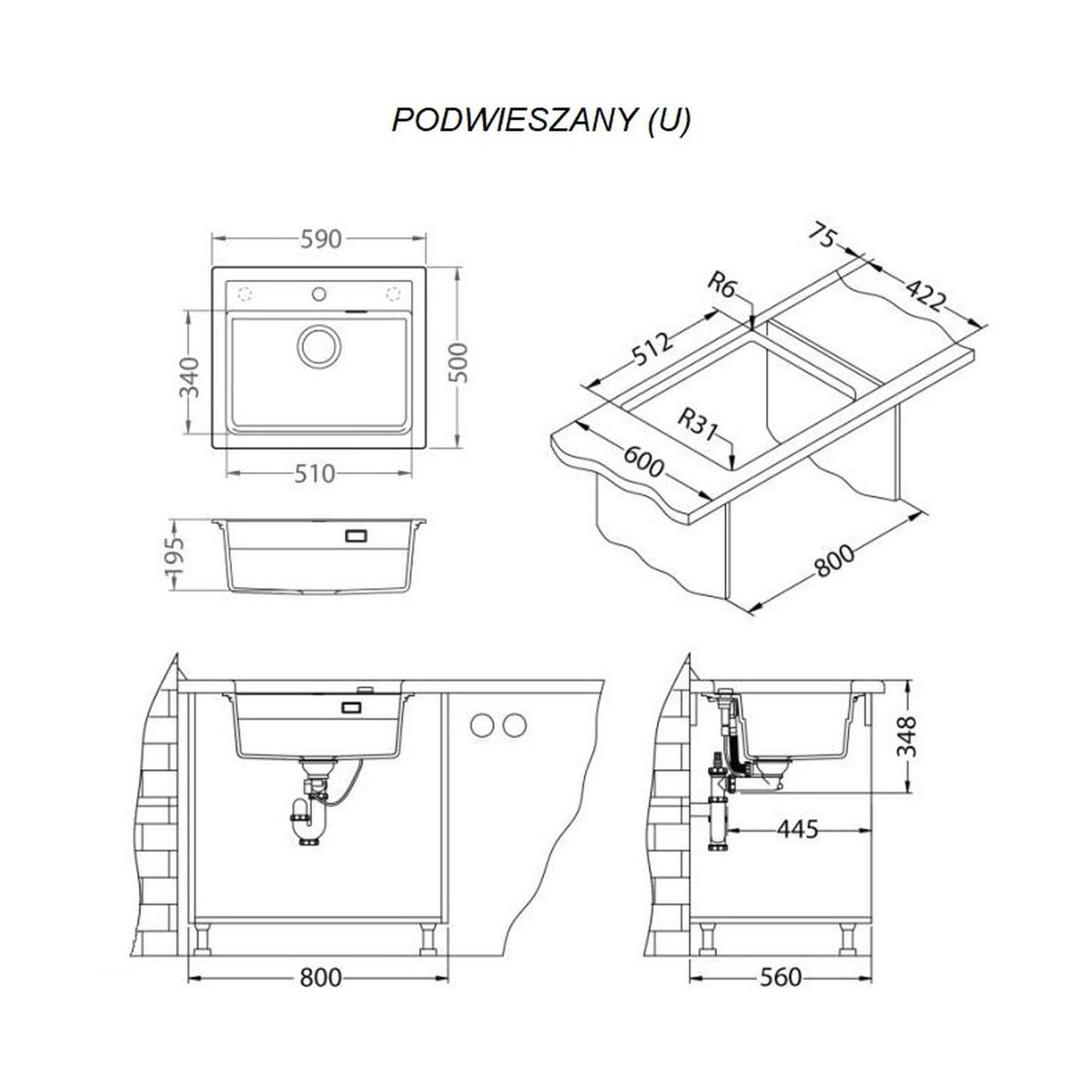 - Ausschnittmaße in der Arbeitsplatte (hängend): 51,2 x 42,2 cm