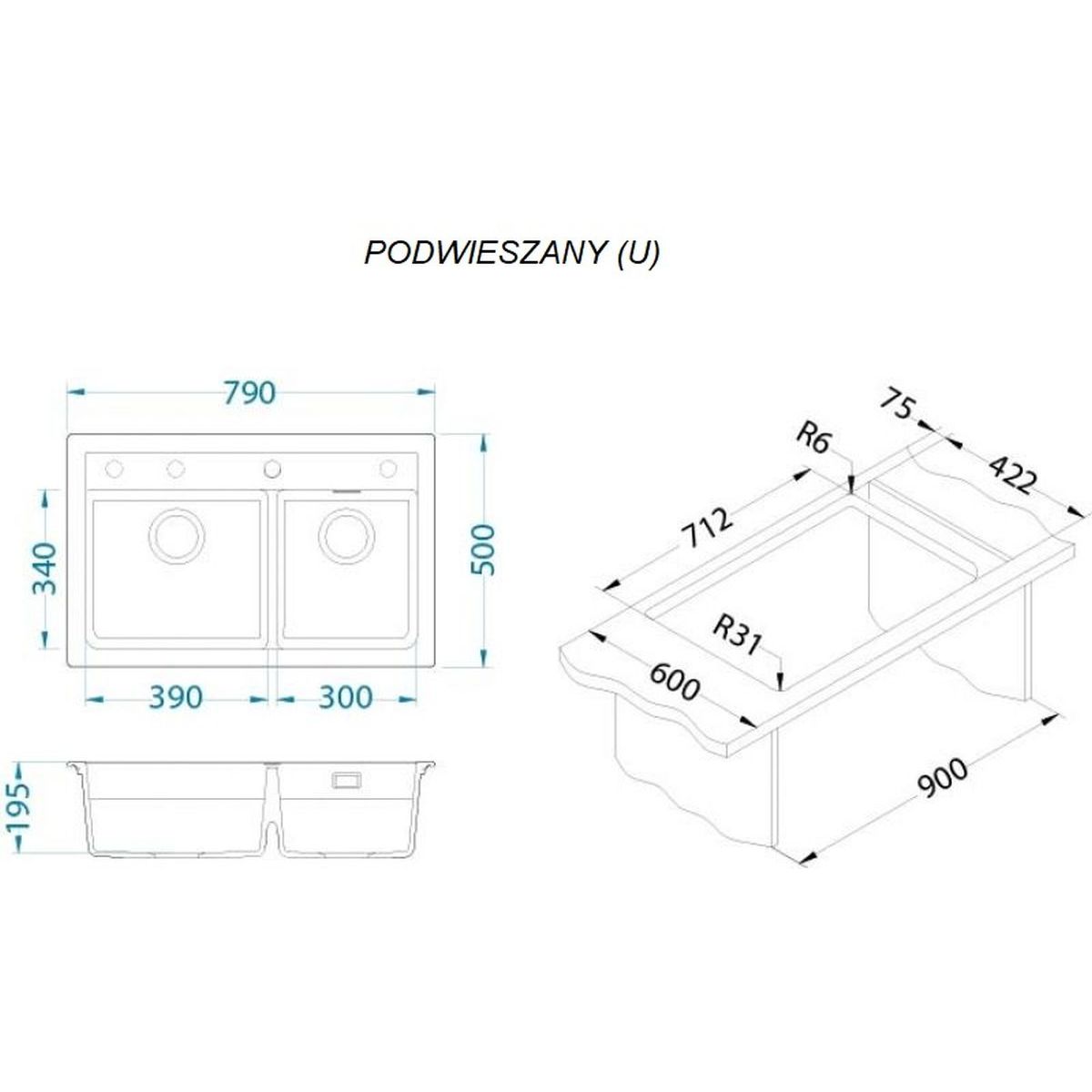 - Ausschnittmaße in der Arbeitsplatte (hängend): 77 x 48 cm