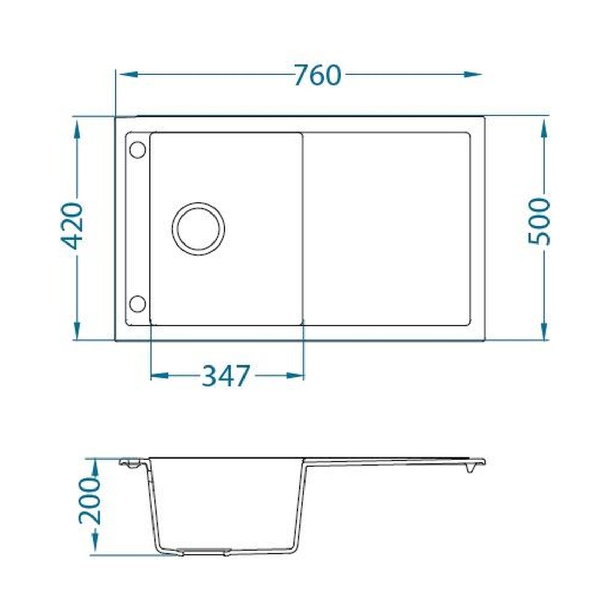 - Abmessungen der Spüle: 760 x 500 x 200 mm