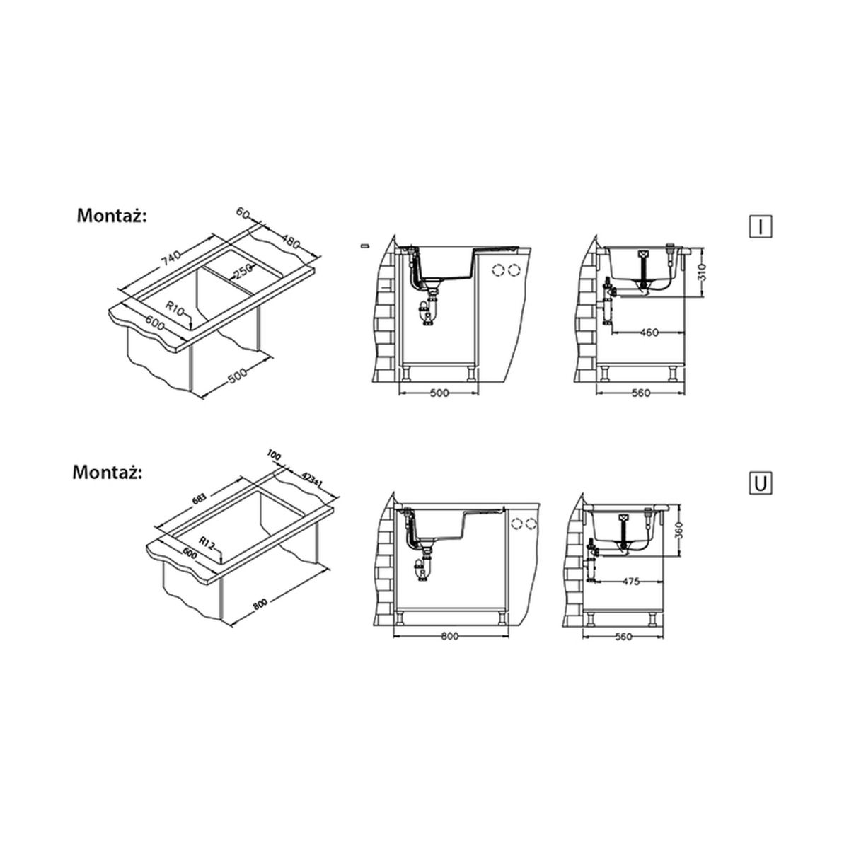 - Ausschnittmaße in der Arbeitsplatte: für I - 740 x 480 mm, für U - 681 x 422 mm