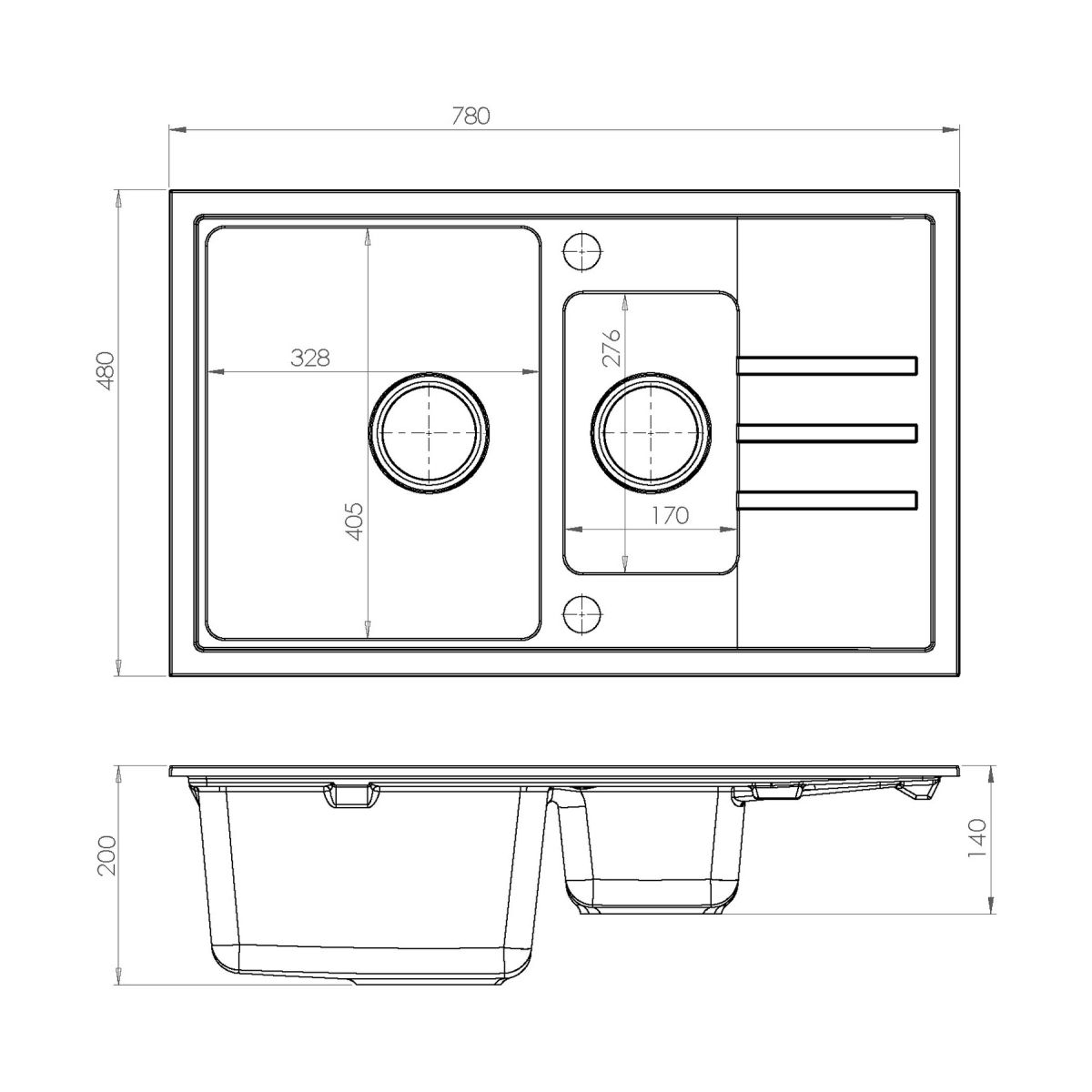 - Abmessungen der Spüle: 780 x 480 x 215 mm