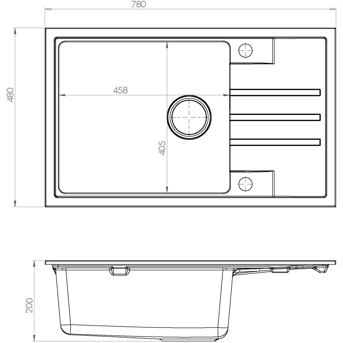 - Abmessungen der Spüle: 780 x 480 x 215 mm