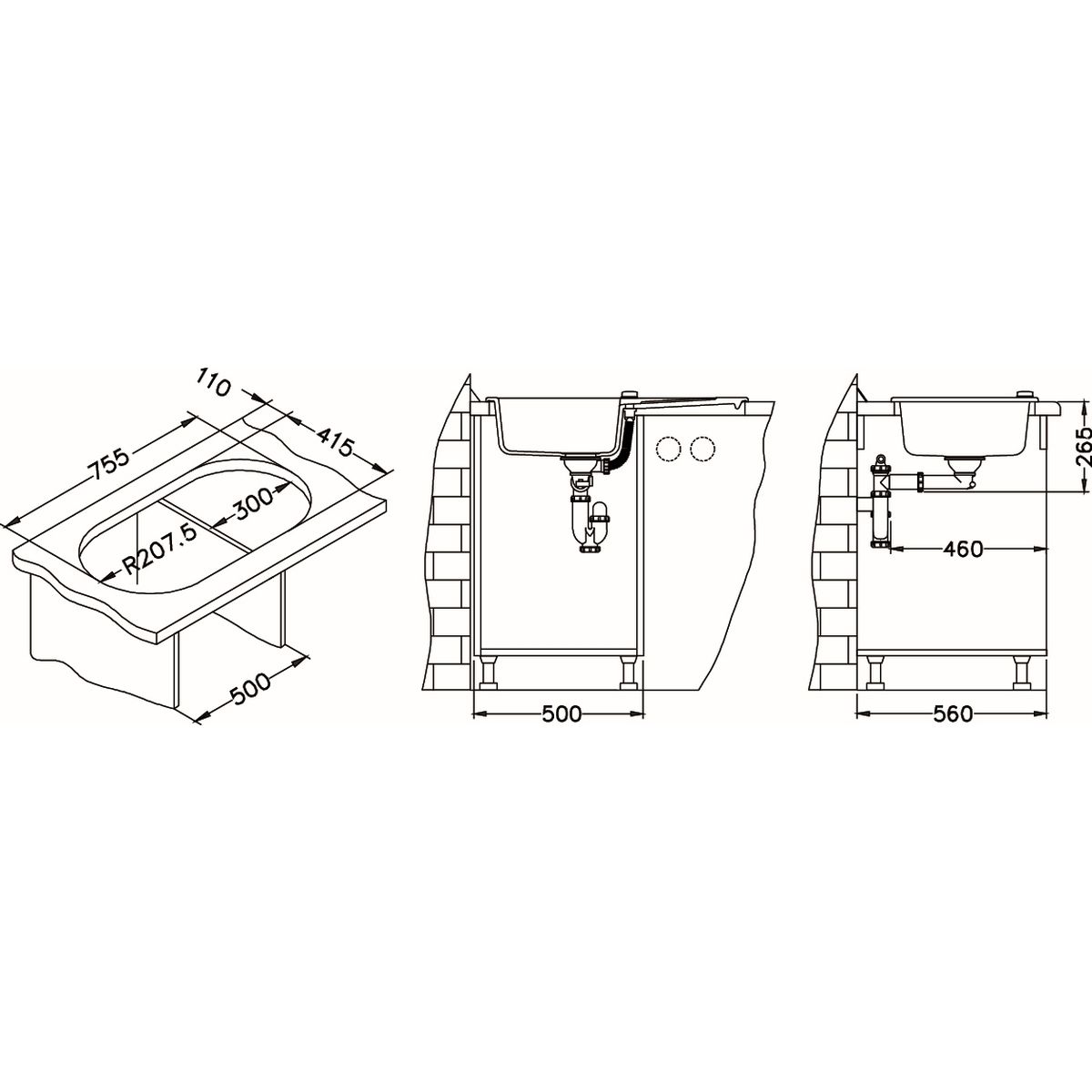 - zwei Öffnungen für die Armatur
