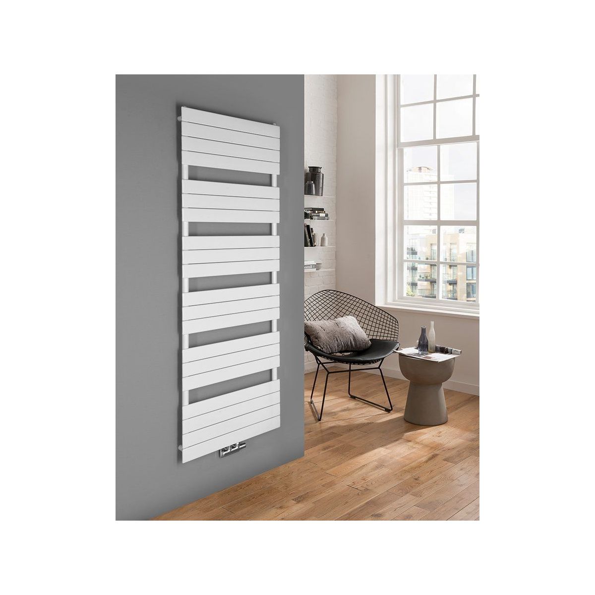 Stilvolle Badleiter aus flachen Stahlprofilen mit praktischer Mittelverbindung im Abstand von 50 mm und Öffnungen in den vertikalen Rohren, die einen seitlichen Anschluss oder die Verwendung eines elektrischen Heizelements ermöglichen.