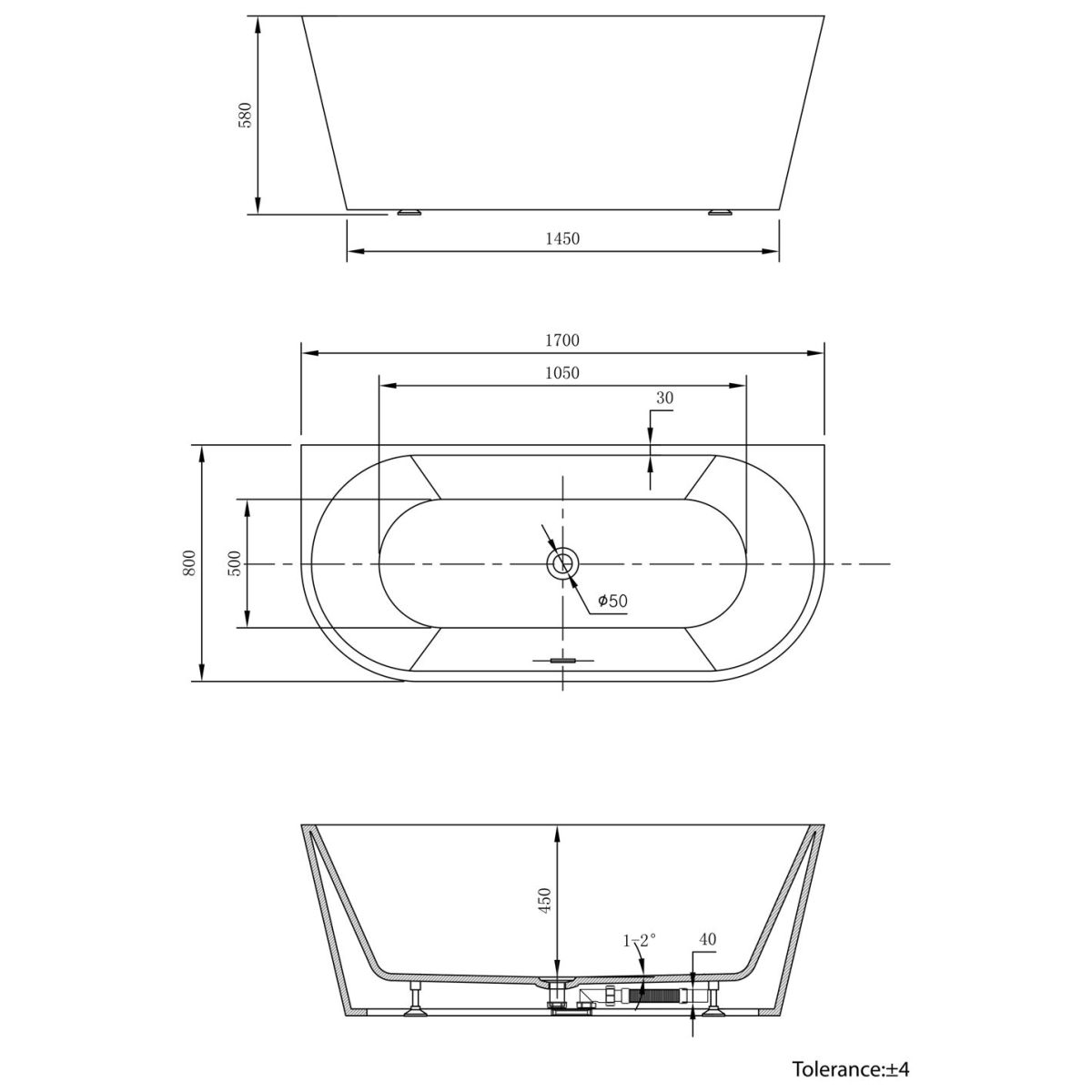 Aqualine Tajo Wandmontierte Badewanne 170x80 cm oval weiß E1980
