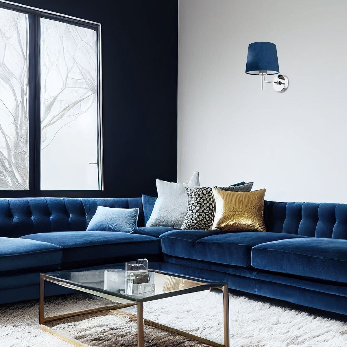 Eine phänomenale Kombination aus Chrom und Stofflampenschirm. Diese Kombination verleiht Ihrem Wohn- oder Schlafzimmer Stil, passt hervorragend zum Glamour-Stil, eignet sich aber auch gut für eher zurückhaltende Innenräume. Die dunkelblaue Farbe verleiht den Räumen Eleganz, und die zeitlose silberne Farbe des Chroms sorgt dafür, dass man den Blick nicht von den Lampen abwenden kann.
