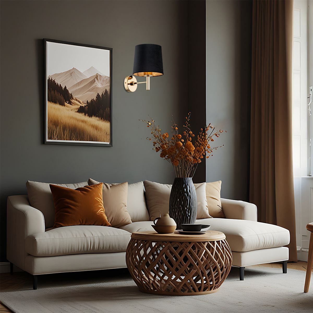 Eine effektvolle, bezaubernde, wunderschöne Wandleuchte. Ponte Plus ist eine Kombination aus einem phänomenalen Stoffschirm und einem stilvollen goldfarbenen Gestell. Wenn Sie die Eleganz Ihres Interieurs unterstreichen möchten, sollten Sie sich für diese schöne Wandleuchte entscheiden, die eine äußerst geschmackvolle Dekoration darstellt. Eine Wandleuchte mit Klasse, die für einen angenehmen Lichtschein sorgt.