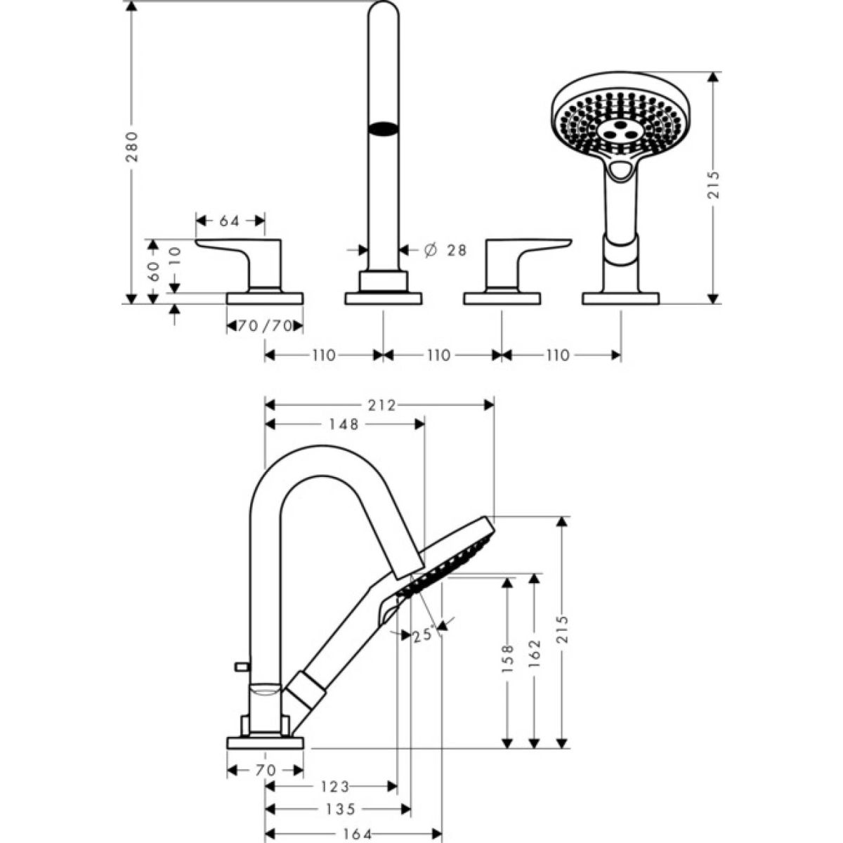 - 4-Loch-Batterie für die Montage am Wannenrand, Duschkopf, Duschschlauch, Duschgriff