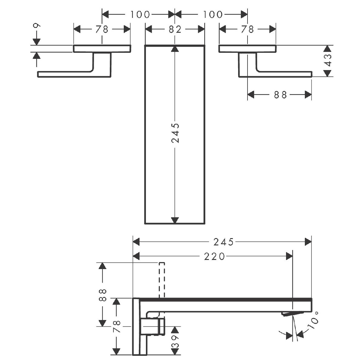- bestehend aus: 3-Loch-Waschtischarmatur für Wandmontage, Unterputz, flach, Ablaufgarnitur