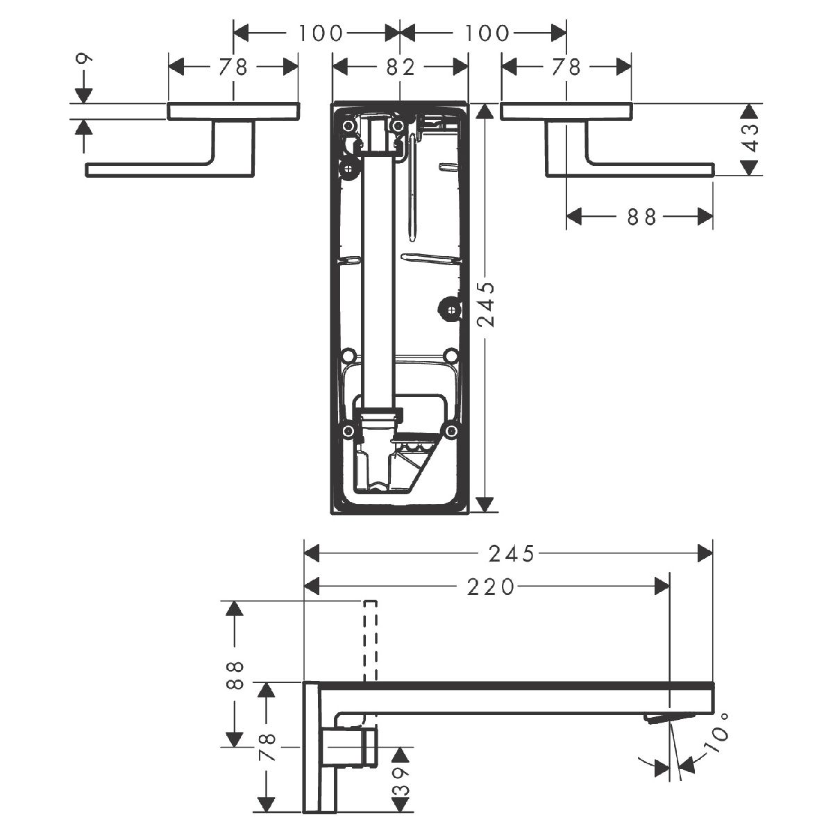 - bestehend aus: 3-Loch-Waschtischarmatur für Wandmontage, Unterputz, Ablaufgarnitur