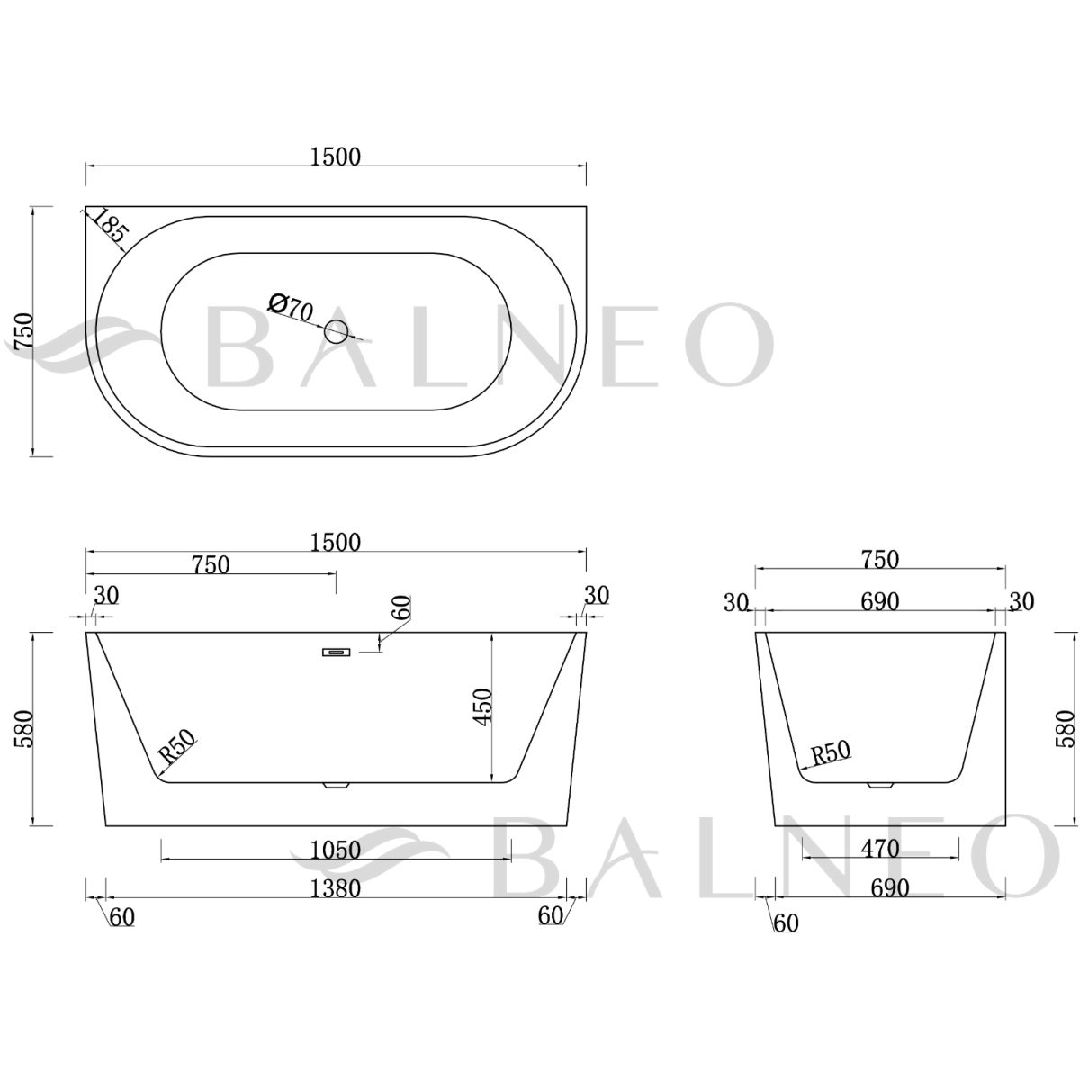 Balneo Viva Wandmontierte Badewanne 150x75 cm oval weiß J0101010102-1