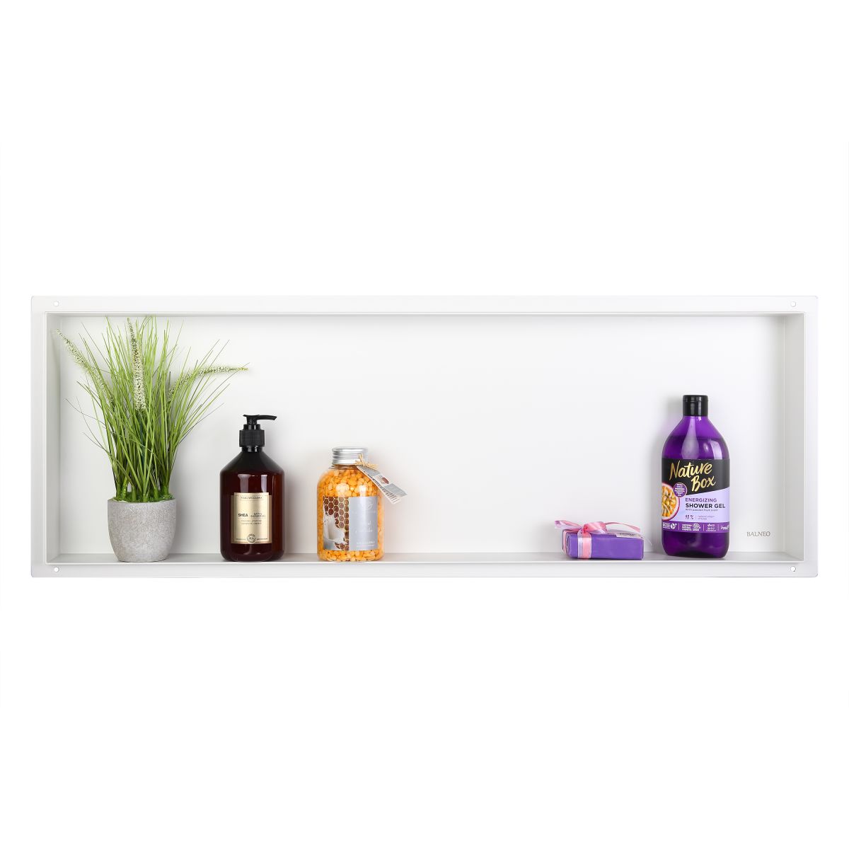 Die rahmenlosen Einbauregale WALL-BOX NO RIM sorgen für Ordnung im Badezimmer und verleihen ihm ein modernes Design. Auf den leicht zugänglichen Regalen können Kosmetika und Parfüms untergebracht werden, in der Duschkabine Shampoos, Gels und andere Badeartikel. Die Nischenregale der Serie WALL-BOX NO RIM können auch zur Raumgestaltung verwendet werden, z. B. im Schlafzimmer anstelle von Nachttischen – für kleine Alltagsgegenstände, in der Küche – für Gewürze oder als Nischen für Dekorationselemente im Wohnzimmer.