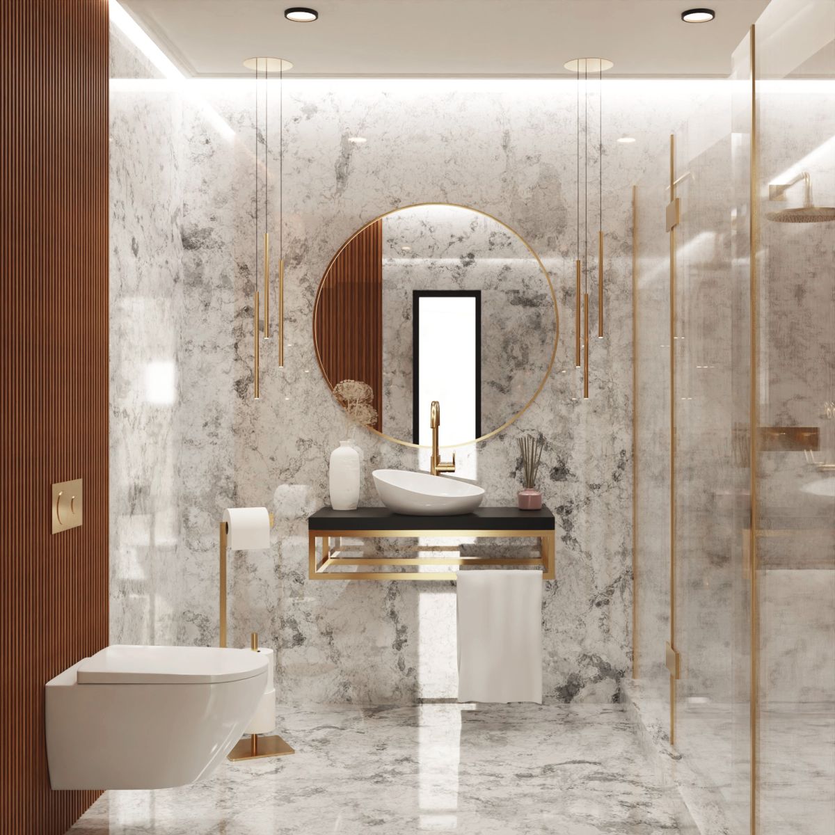 Das hängende Regal unter dem Waschbecken ist eines der besten Badmöbel. Es ersetzt perfekt die üblichen Waschbeckenunterschränke. Modernistisch, aus Stahl gefertigt, für den Einsatz im Badezimmer geeignet. Das Produkt kann als Möbelstück verwendet werden, auf dem ein Waschbecken oder eine Arbeitsplatte im Badezimmer platziert werden kann. Das Regal ist aus Materialien höchster Qualität gefertigt. Es ist vollständig verschweißt, wodurch es sich als Möbelstück durch außergewöhnliche Stabilität auszeichnet. Die Konstruktion besteht aus Stahl und ist mit korrosionsbeständigen Lacken lackiert. Die Arbeitsplatte besteht aus einer 18 mm dicken schwarzen Acrylplatte. Die schlichte Form in Kombination mit der goldenen Farbe des Rahmens macht das Produkt geeignet für Innenräume im Glamour-, Modern- und Art-Déco-Stil.