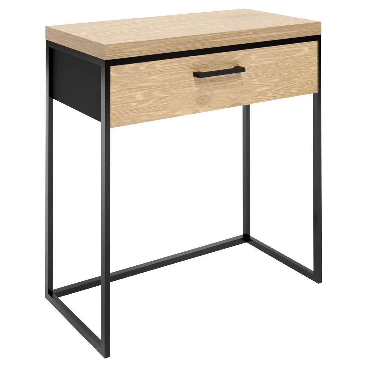 Die Badezimmerkonsole mit Schublade ist eines der beliebtesten Badezimmermöbelstücke. Sie ersetzt perfekt die üblichen Waschbeckenschränke. Modernistisch, aus Stahl und Naturholz gefertigt, für den Einsatz im Badezimmer geeignet. Das Produkt kann als Möbelstück verwendet werden, auf dem ein Waschbecken platziert wird, oder als eigenständiger Teil der Badezimmerausstattung. Die Konsole ist aus Materialien höchster Qualität gefertigt. Sie ist vollständig verschweißt, wodurch sie sich als Möbelstück durch außergewöhnliche Stabilität auszeichnet. Die Konstruktion besteht aus Stahl und ist mit korrosionsbeständigen Lacken lackiert. Die Platte besteht aus Eichenholz und ist entsprechend gegen Feuchtigkeit geschützt. Unter der Platte befindet sich eine Schublade mit Holzfront. Der minimalistische, schlichte, fast strenge Stil der Konsole macht das Produkt geeignet für Loft- und moderne Innenräume und dank des natürlichen Holzes auch für rustikale Einrichtungen.