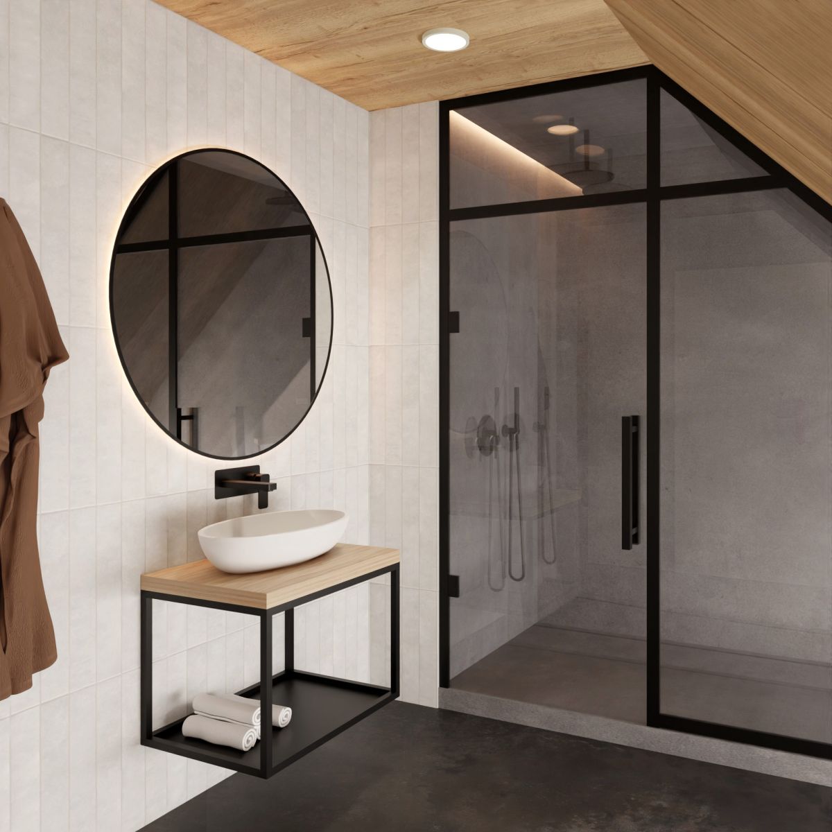 Die hängende Badkonsole ist eines der funktionalsten Badmöbel. Sie ersetzt perfekt die üblichen Waschbeckenschränke. Modernistisch, aus Stahl und Naturholz gefertigt, für den Einsatz im Badezimmer geeignet. Das Produkt kann als Möbelstück verwendet werden, auf dem ein Waschbecken platziert wird, oder als eigenständiger Teil der Badezimmerausstattung. Die Konsole ist aus Materialien höchster Qualität gefertigt. Sie ist vollständig verschweißt, wodurch sie sich als Möbelstück durch außergewöhnliche Stabilität auszeichnet. Die Konstruktion besteht aus Stahl und ist mit korrosionsbeständigen Lacken lackiert. Die Platte besteht aus Eichenholz und ist entsprechend gegen Feuchtigkeit geschützt. Der minimalistische, schlichte, fast rohe Stil der Konsole macht das Produkt geeignet für Loft- und moderne Innenräume und dank des natürlichen Holzes auch für rustikale Einrichtungen.
