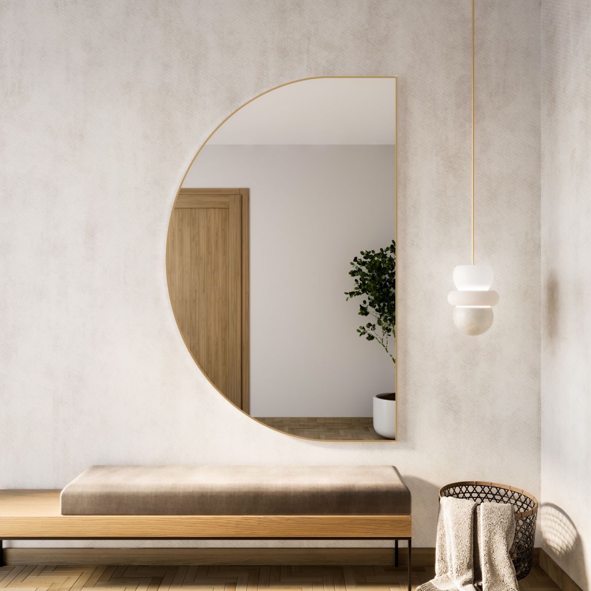 Die Produkte der Serie Tiny Border Semi Round wurden für einen modernen Stil entworfen und eignen sich perfekt als Badezimmerspiegel, Wohnzimmerspiegel oder Flurspiegel. Die Kombination aus Funktionalität und Ästhetik in Verbindung mit einem minimalistischen Rahmen verleiht diesem Spiegel ein frisches und unkonventionelles Aussehen.