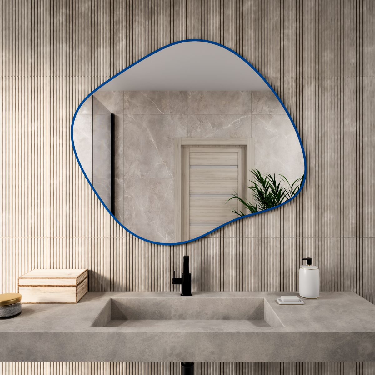 Der Spiegel ist von einem minimalistischen, lackierten Rahmen in Blau umgeben.