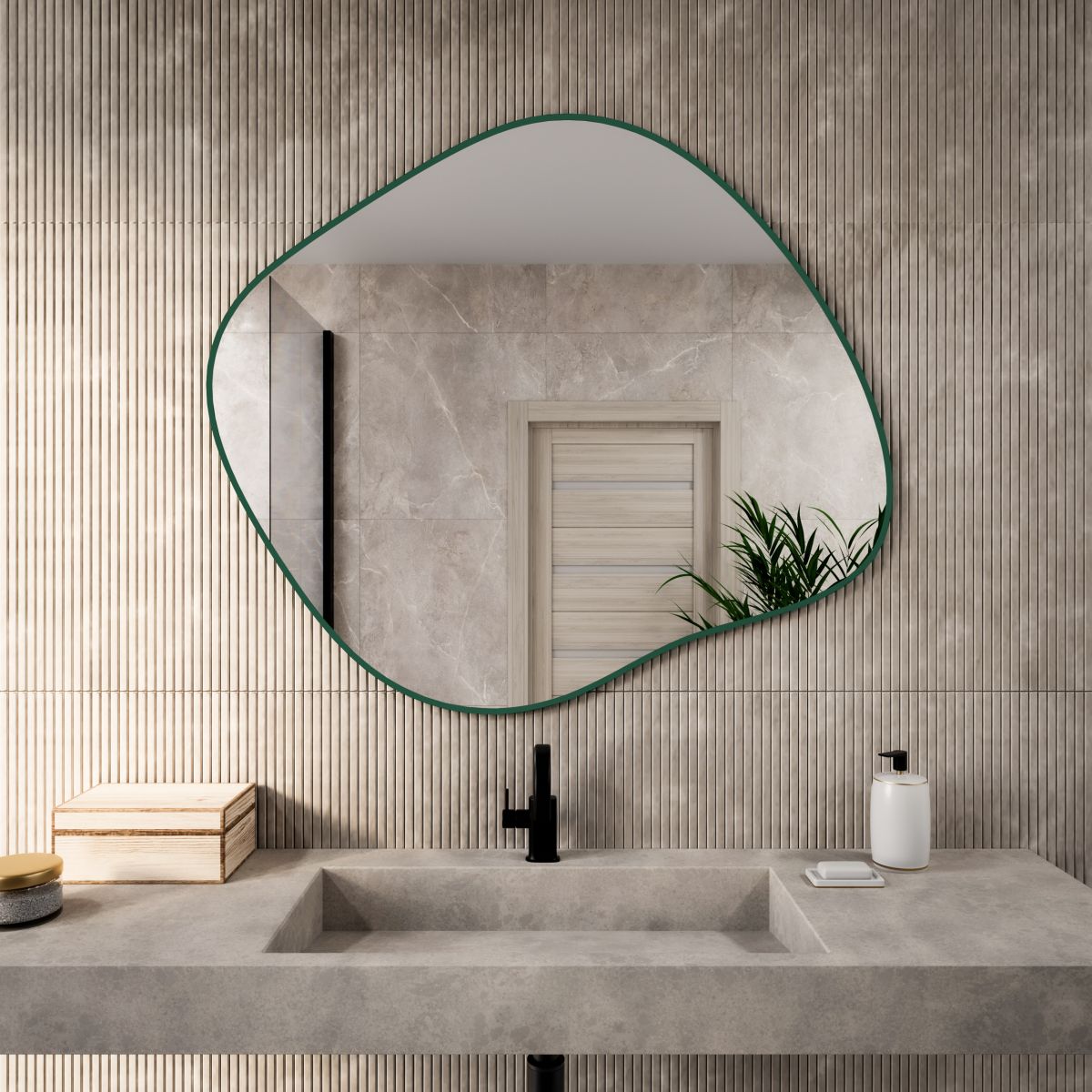 Der Spiegel ist von einem minimalistischen, lackierten Rahmen in Flaschengrün umgeben.