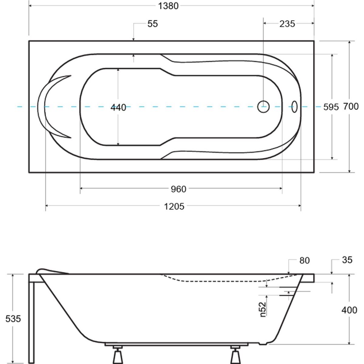- Der Abfluss befindet sich an der Seite der Wanne
