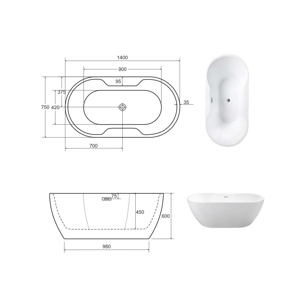 Besco Navia Freistehende Badewanne 140x75 cm oval weiß #WAS-140-NZL