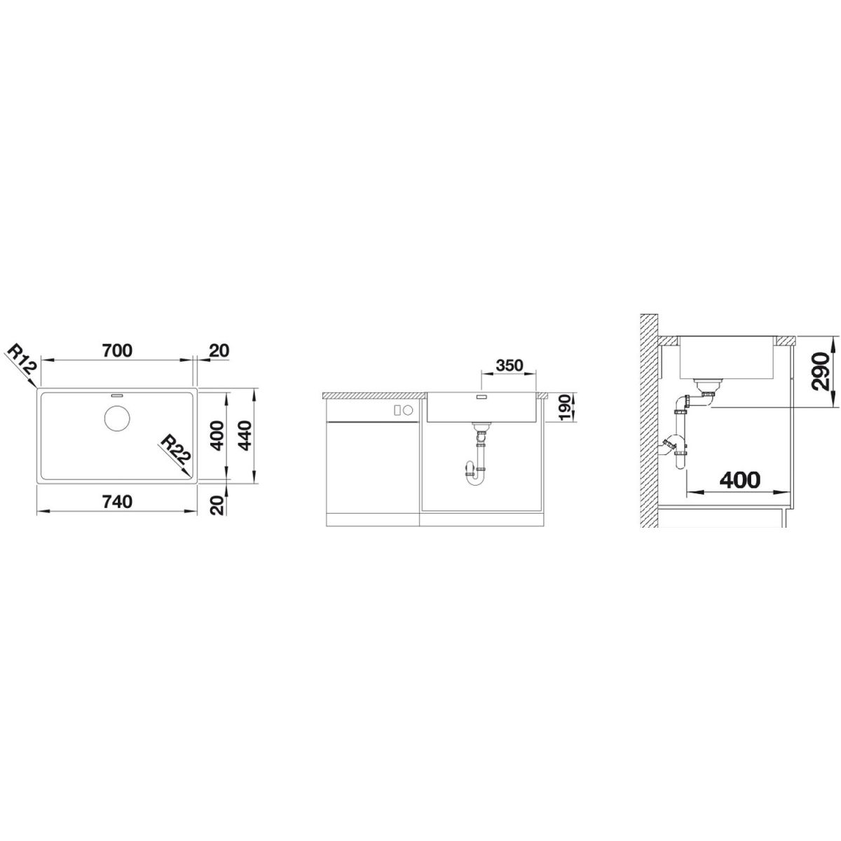 - Abmessungen der Spüle: 74 x 44 cm