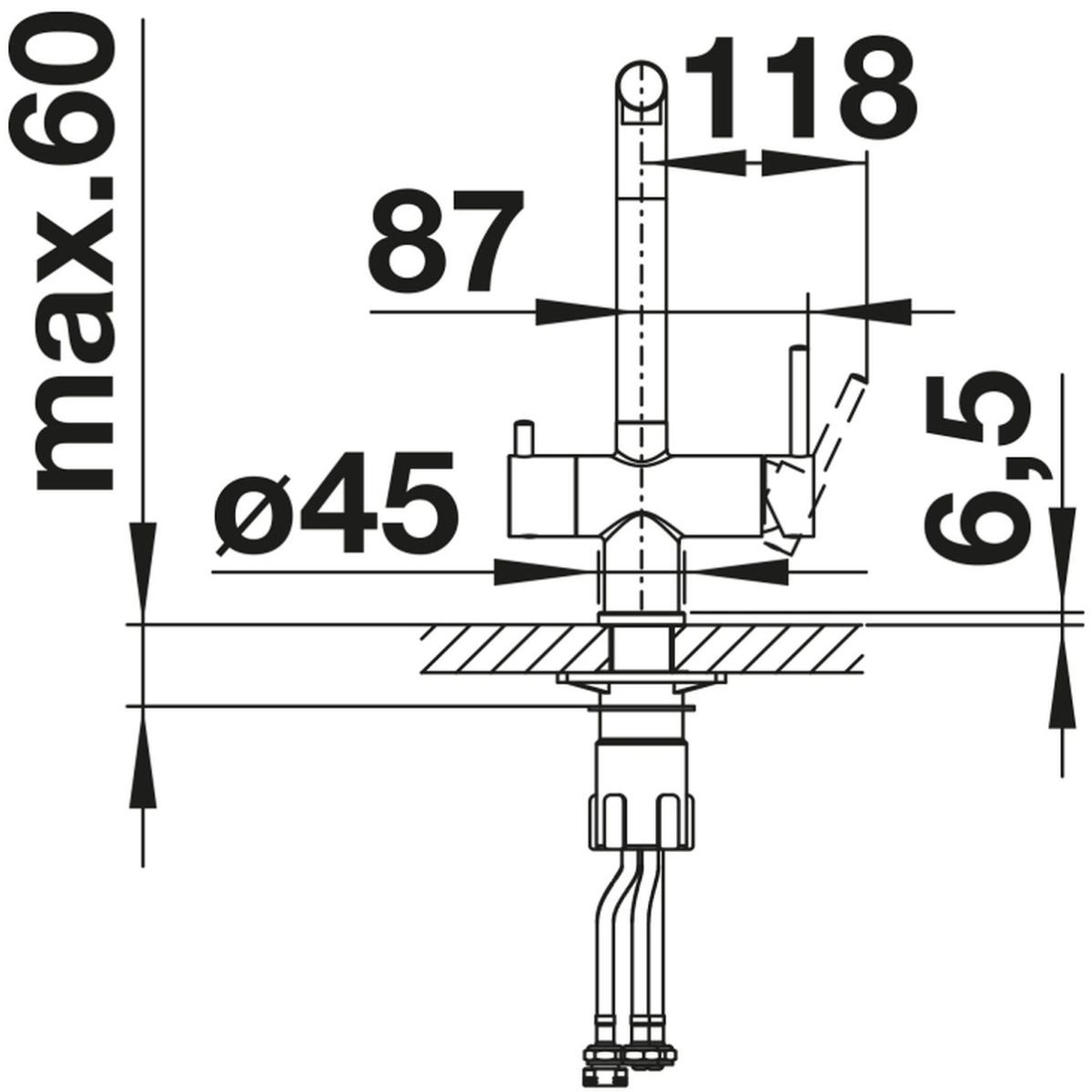 - Erforderliche Öffnung für die Armatur mit einem Durchmesser von 35 mm