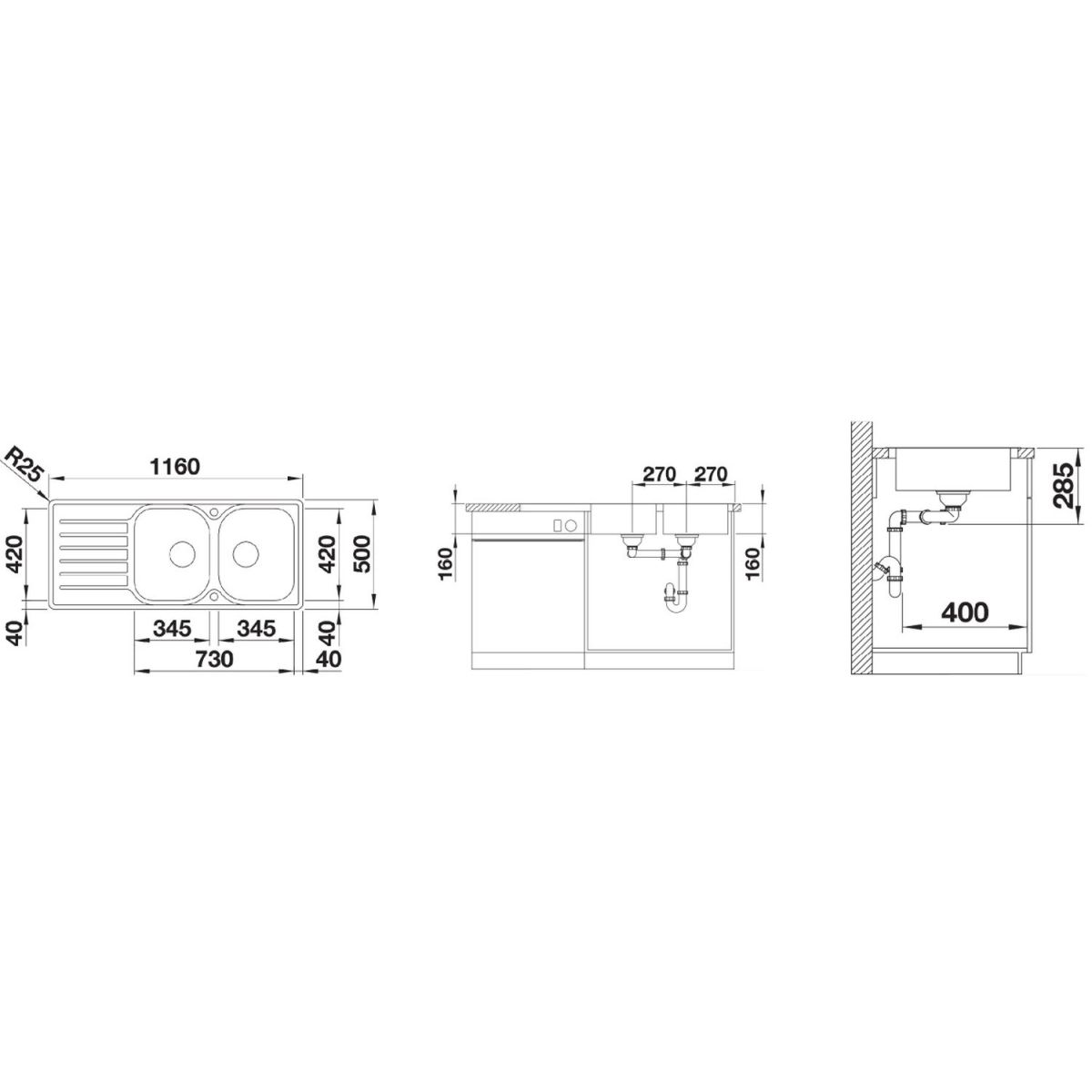 - Abmessungen der Spüle: 116 x 50 cm