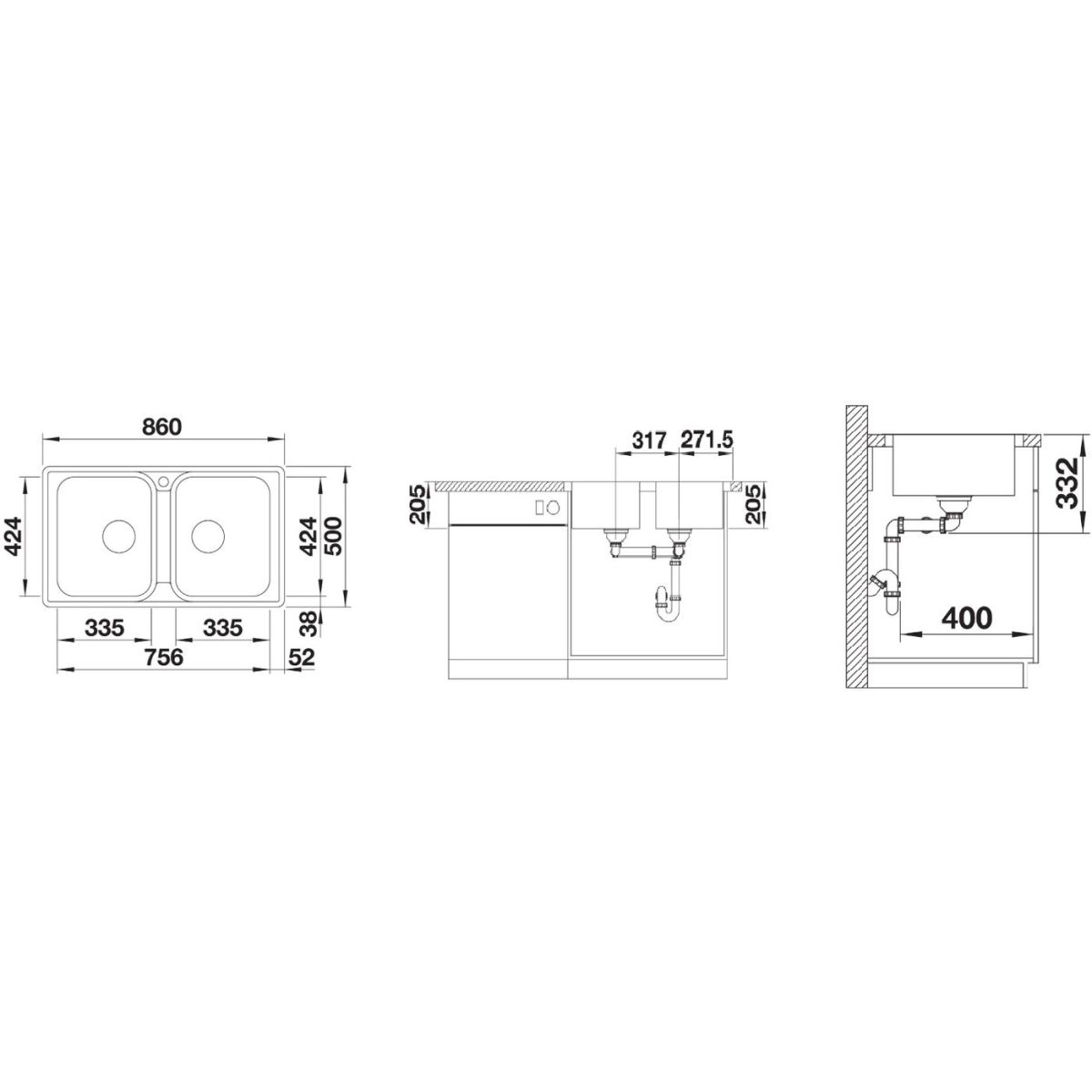 - Abmessungen der Spüle: 86 x 50 cm