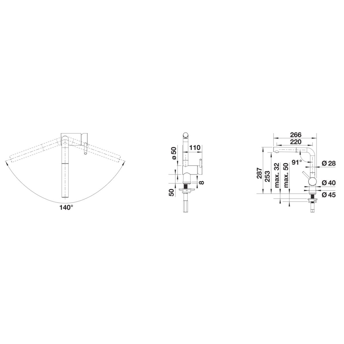 - Schwenkwinkel: 140°