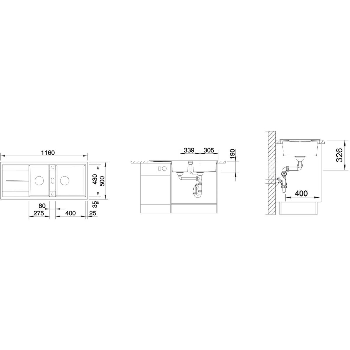 - Abmessungen der Spüle: 116 x 50 cm