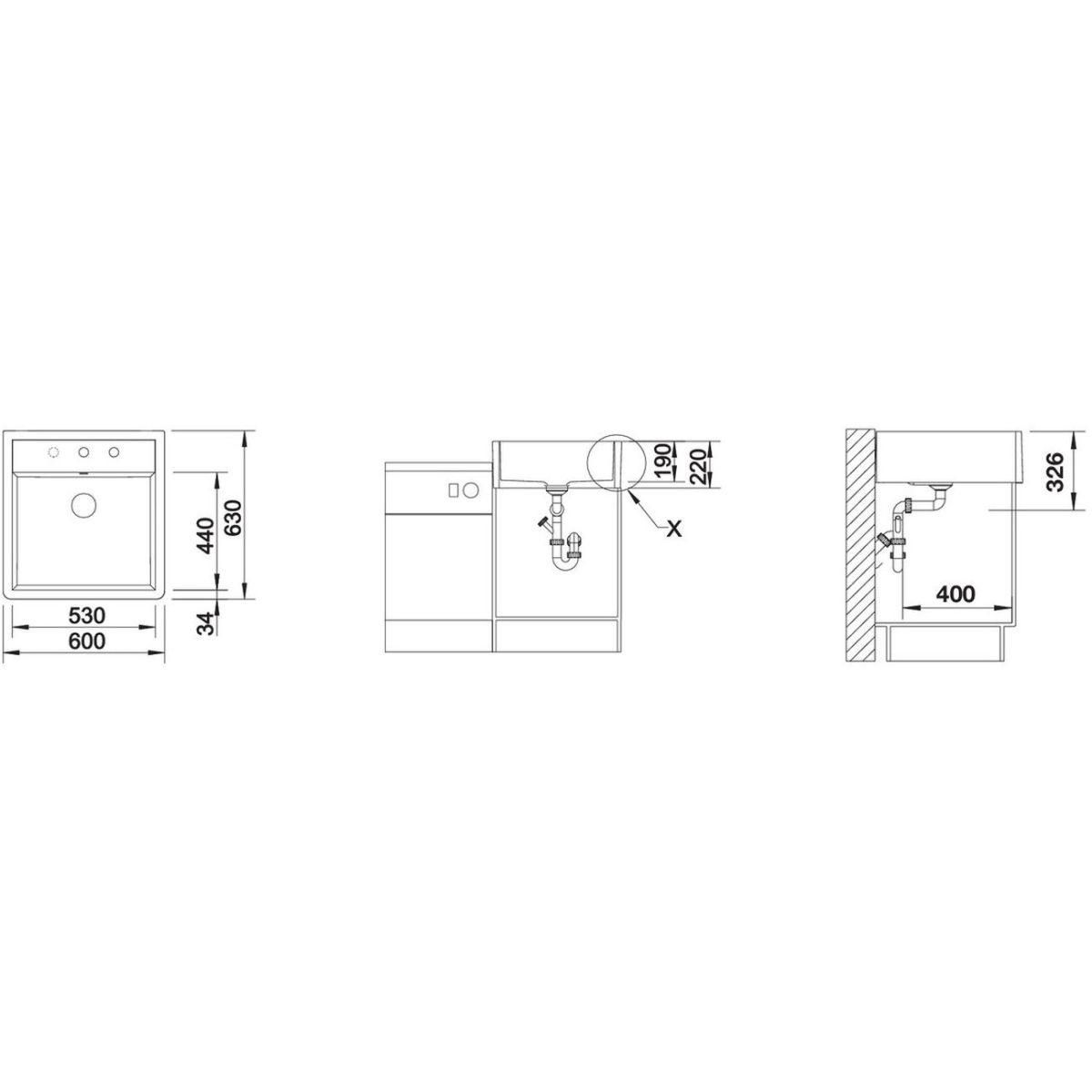 - Abmessungen der Spüle: 60 x 63 cm