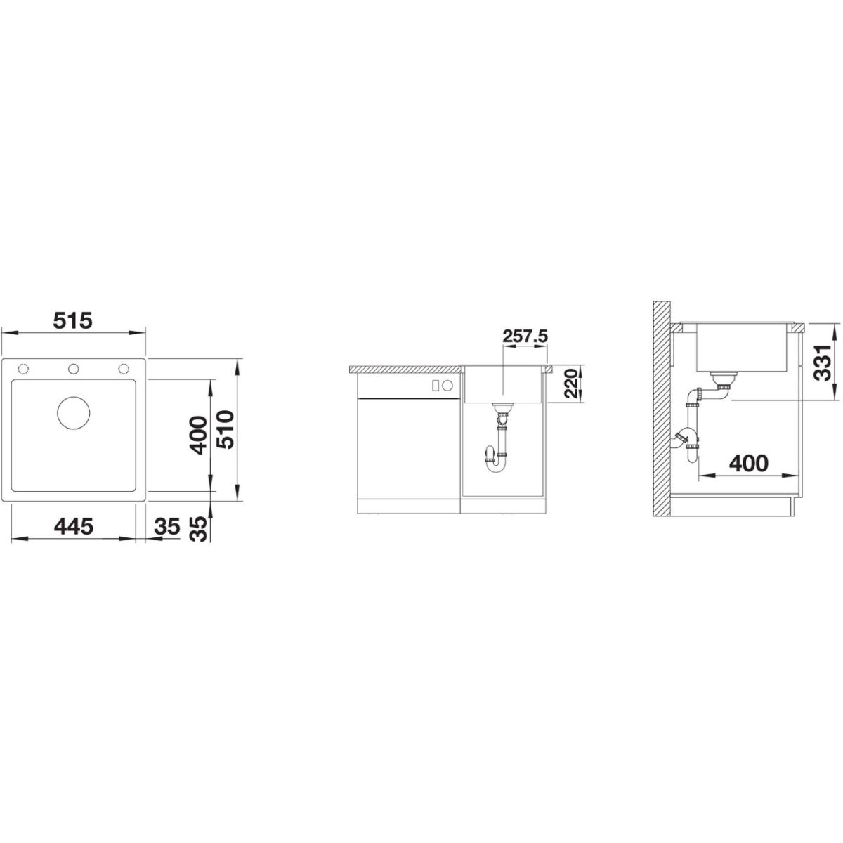 - Abmessungen der Spüle: 51,5 x 51 cm