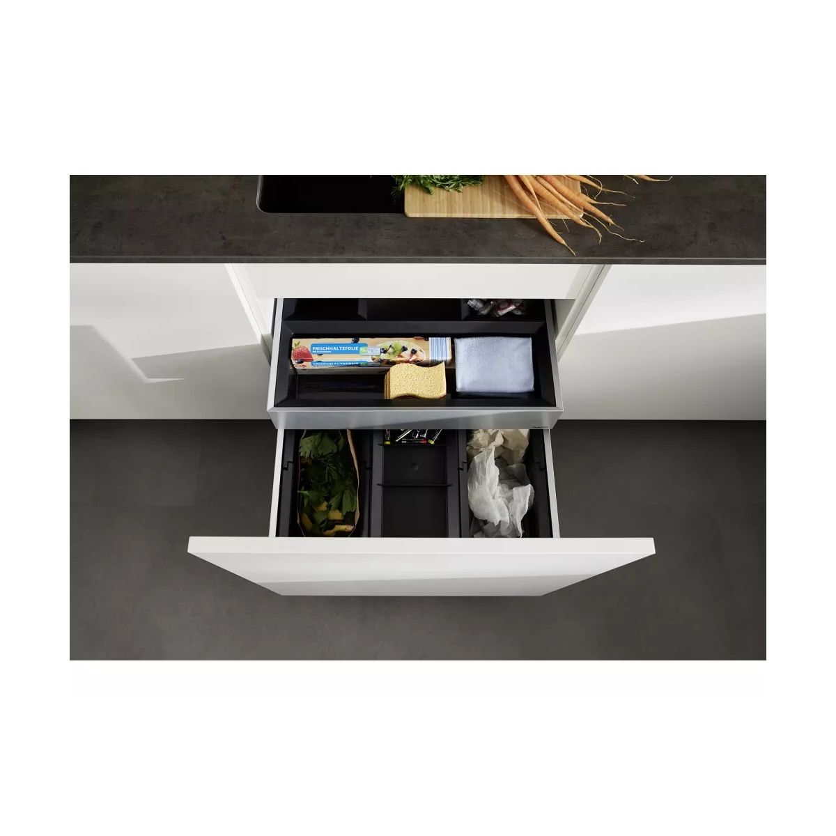 - Im Lieferumfang enthalten: Ausziehsystem für den Korb, das an der Vorderseite des Schranks befestigt wird, Organisationsschublade, 3 x 15-Liter-Korb