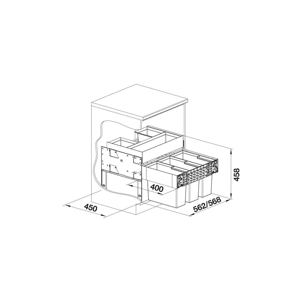 - Einbauhöhe 456 mm (die eingesetzten Universalbehälter können bei Bedarf verschoben werden, um z. B. Platz für Überlauf- und Ablaufarmaturen zu schaffen), Einbautiefe 400 mm, erforderliche Innenmaße des Schranks für die Führungen 450 mm