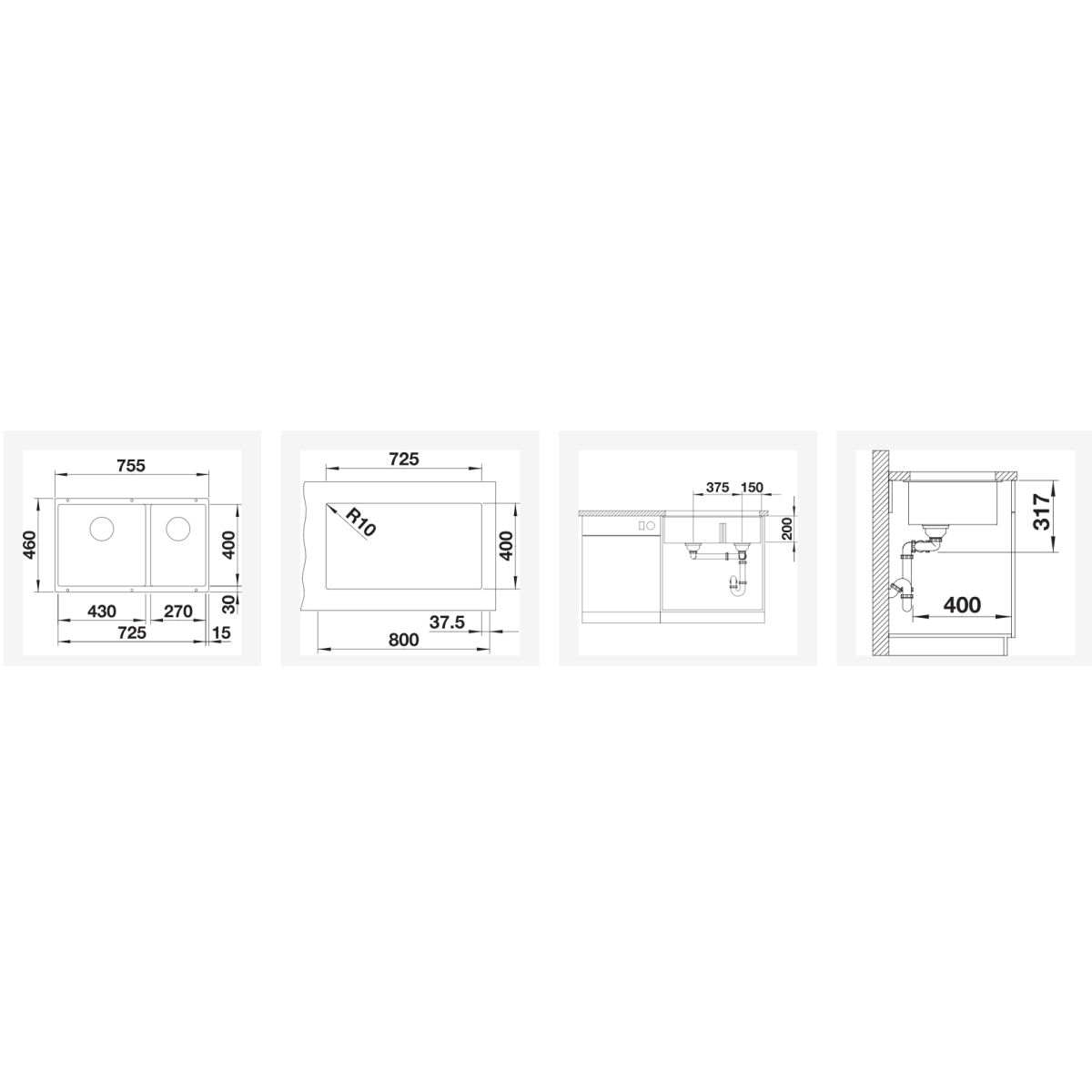 - zwei Kammern, eine Öffnung in der Arbeitsplatte und eine Montagemöglichkeit