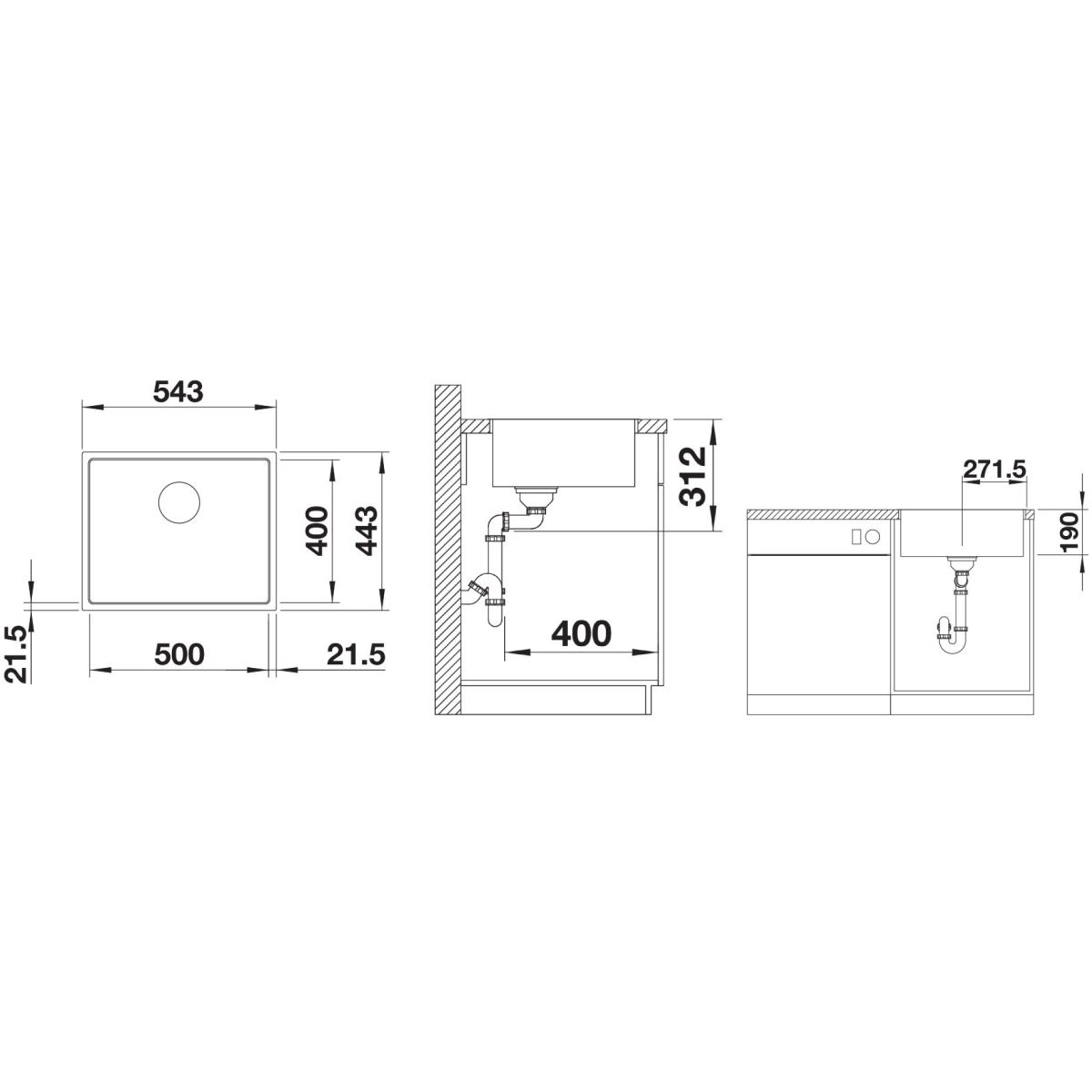 - Abmessungen des Spülbeckens: 54,3 x 44,3 x 19 cm
