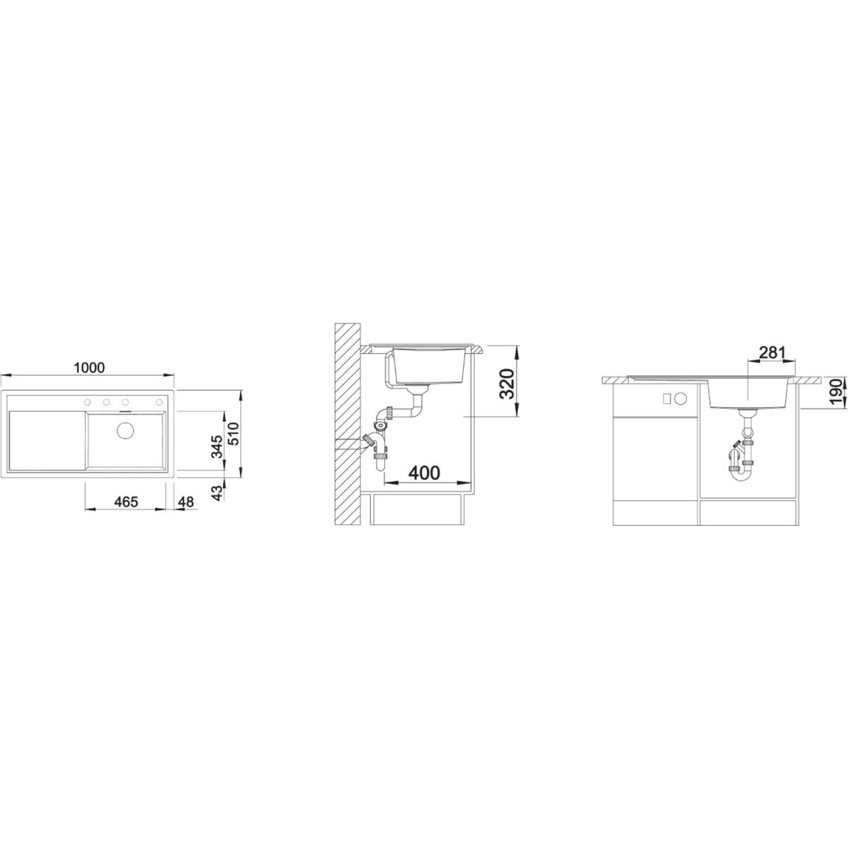 Der Preis gilt für eine Spüle ohne Wasserhahnloch. Die technische Zeichnung zeigt eine Spüle mit einer Kammer auf der rechten Seite.