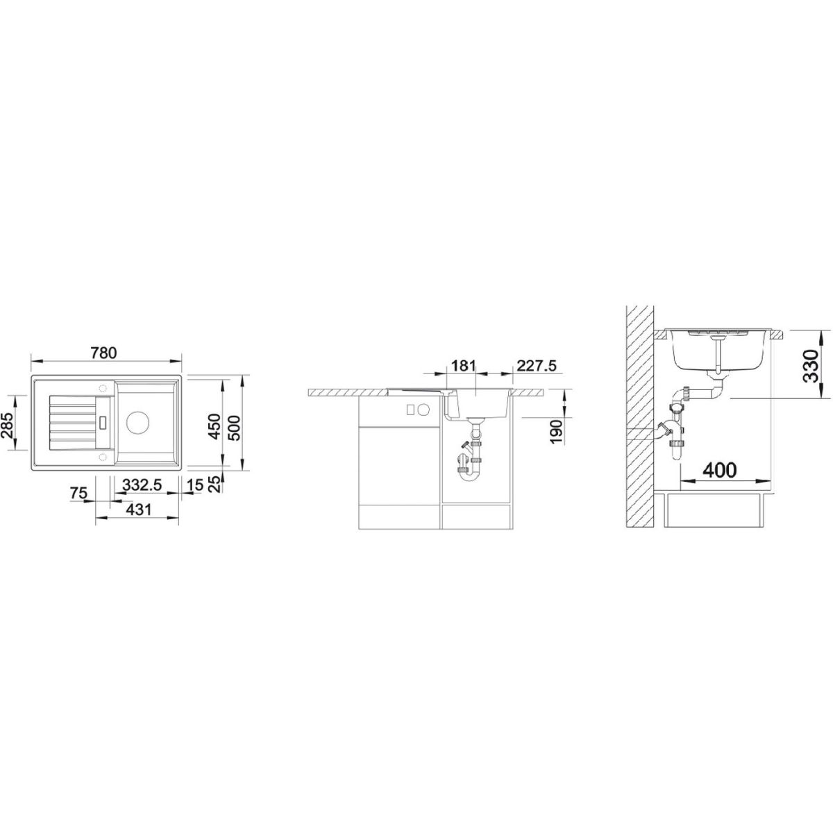 - Abmessungen der Spüle: 78 x 50 cm
