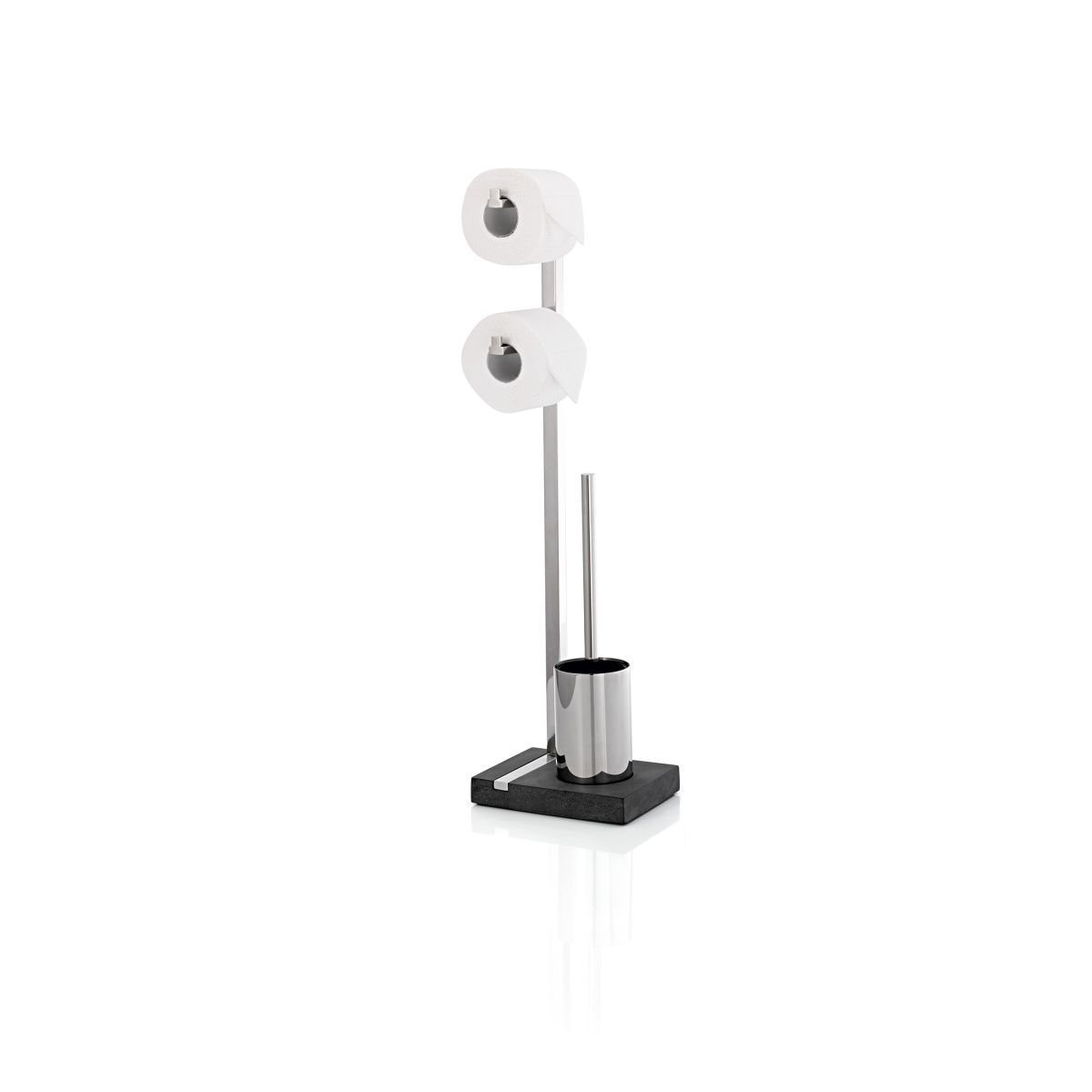 Eleganter und stabiler Toilettenpapierhalter mit Platz für zwei Rollen. Zusätzlich ist der Halter mit einer Toilettenbürste ausgestattet. Zeitloses, minimalistisches Design und hochwertige Materialien – Edelstahl und Polystone. Der Halter hat einen schweren Sockel, ist daher stabil, kann aber gleichzeitig an jedem beliebigen Ort aufgestellt werden.