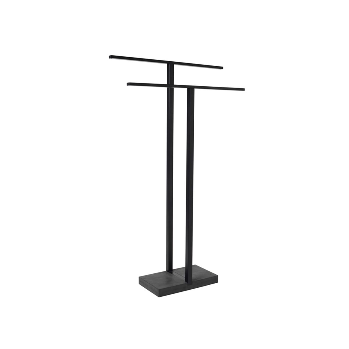 Der Handtuchhalter hat einen schweren Sockel, wodurch er stabil steht, aber gleichzeitig an jedem beliebigen Ort aufgestellt werden kann. Die schwarze Farbe passt perfekt zu den aktuellen Trends in der Badezimmergestaltung.