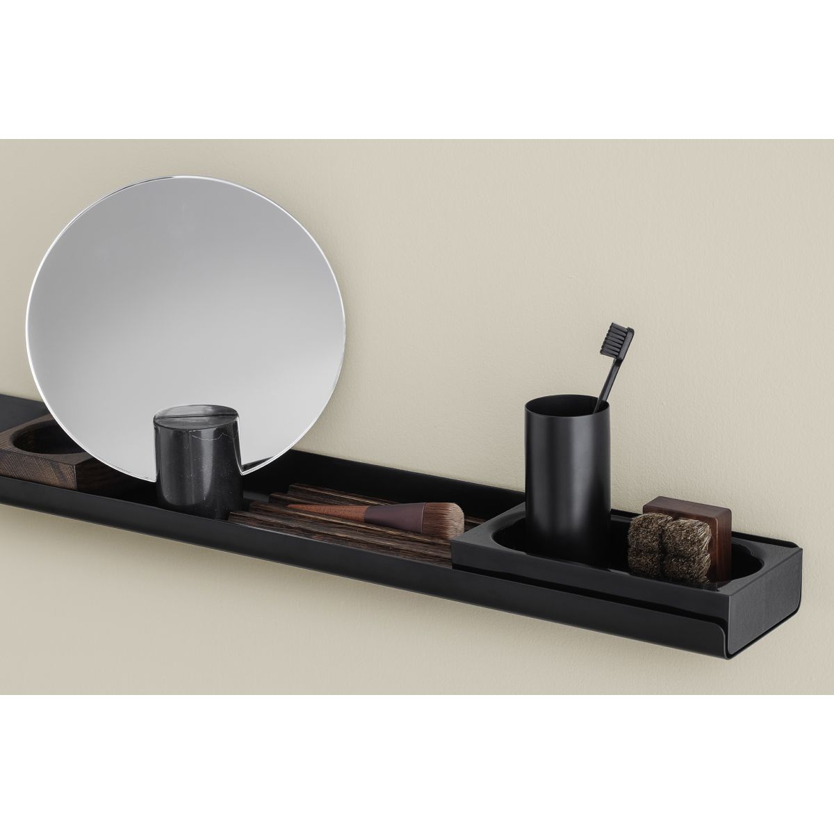 Praktischer Behälter – Ablage für verschiedene Accessoires, die im Badezimmer nützlich sind, Kosmetika, Bürsten usw. Das Produkt ist aus schwarzem Acryl gefertigt und daher sehr pflegeleicht. Die Größe wurde an das Regal aus derselben Serie angepasst.