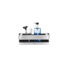 Die Duschablage aus Edelstahl verfügt über einen Boden in Form einer herausnehmbaren Kunststoffschale mit Löchern. Im Inneren befindet sich zusätzlich ein Gummiband, das kleine Kosmetikartikel hält.