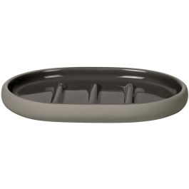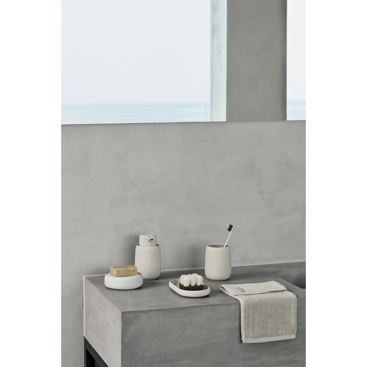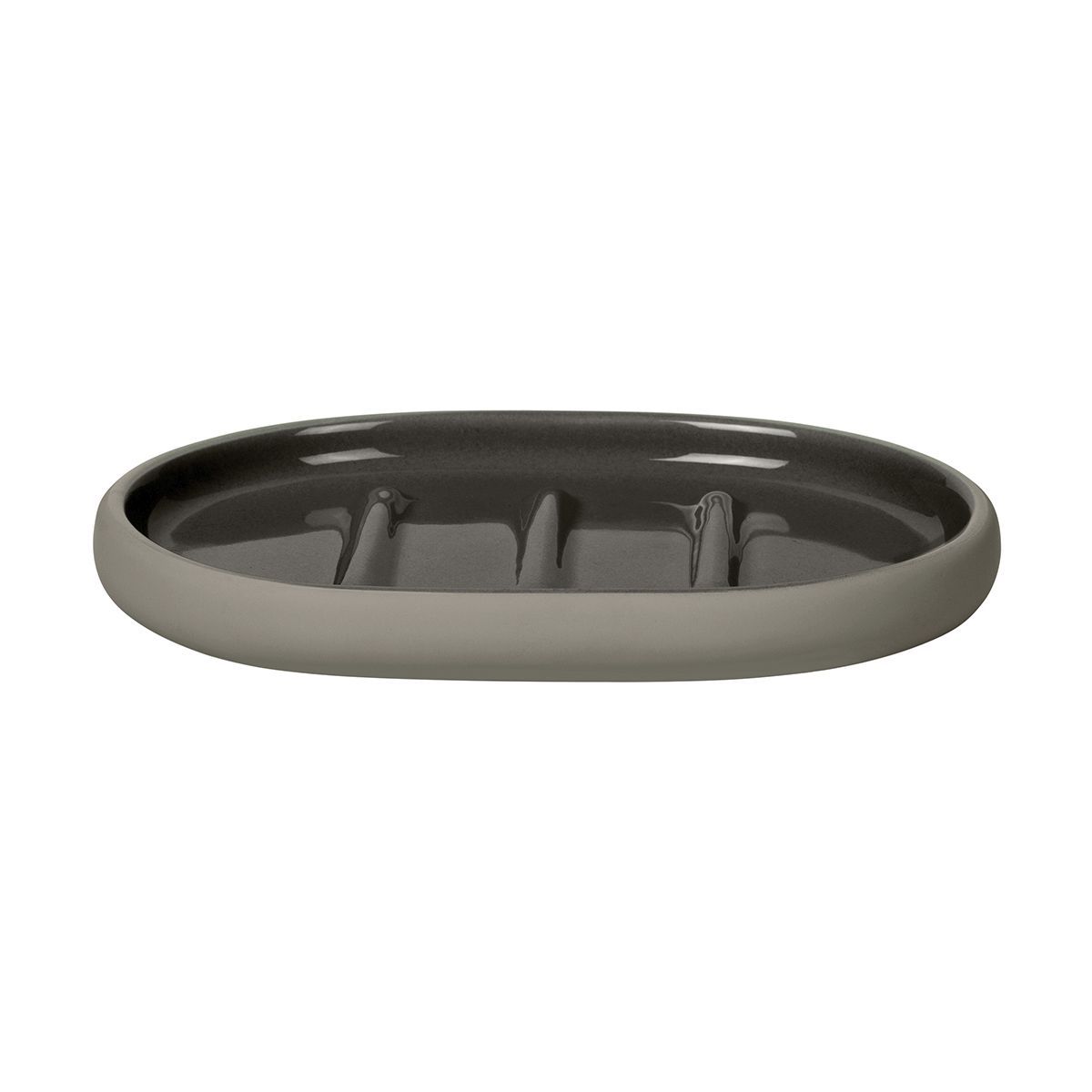 Seifenschale aus der Serie Sono. Das Produkt ist aus Keramik gefertigt, innen glasiert und mit Rillen versehen, die das Abfließen des Wassers von der Seife erleichtern, außen mit einer satinierten, matten Beschichtung.