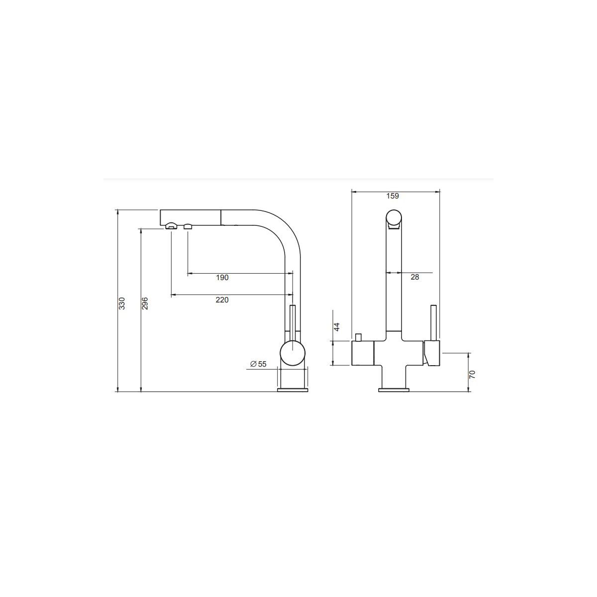 Batterie mit ausziehbarem Auslauf und Anschluss für gefiltertes Wasser.