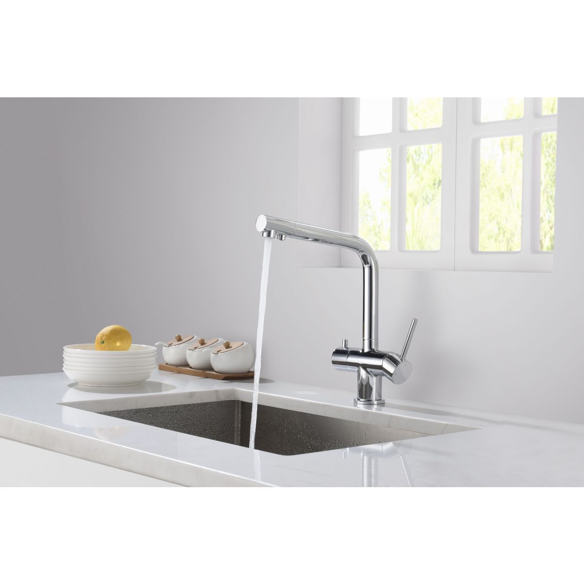 - 2 Perlatoren, vier Wasseranschlüsse: warmes und kaltes Wasser, gefiltertes Wasser in zwei Versionen: reines Wasser und mineralisiertes Wasser