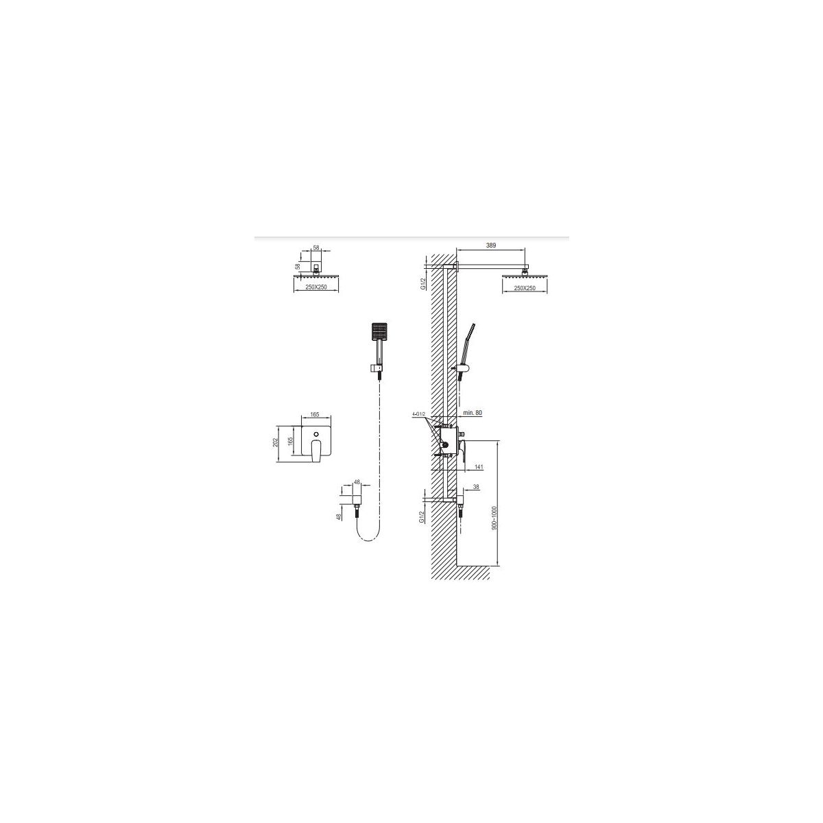 - Duschkopf 250x250 mm, quadratisch, aus Messing, Slim