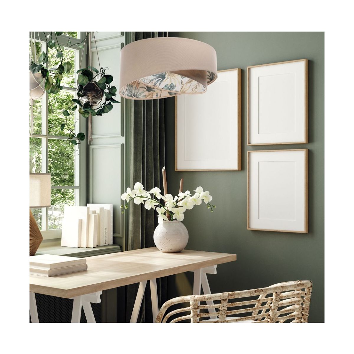 - Farbe der Innenseite des Lampenschirms: Stoff mit Grafik, Beige- und Grüntöne