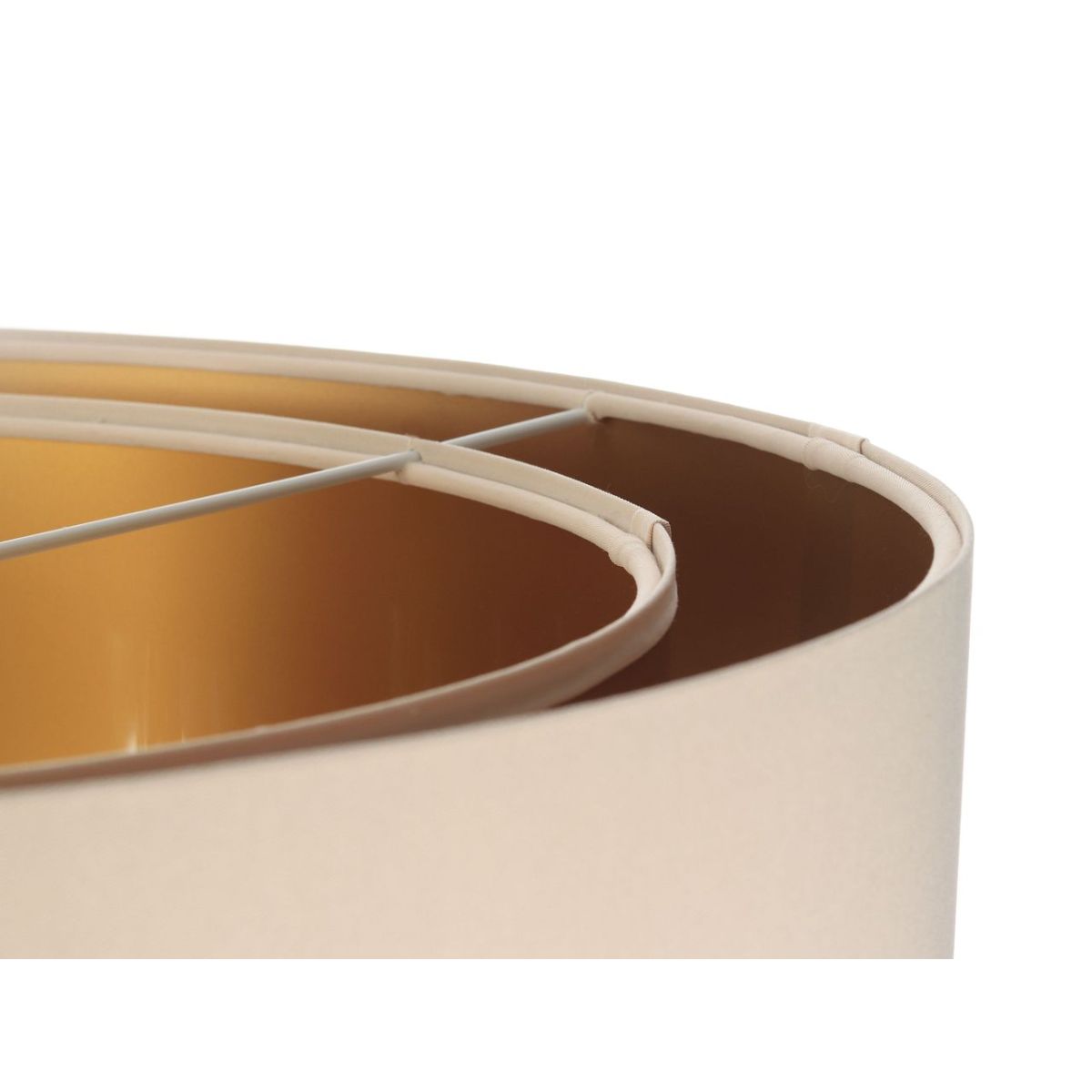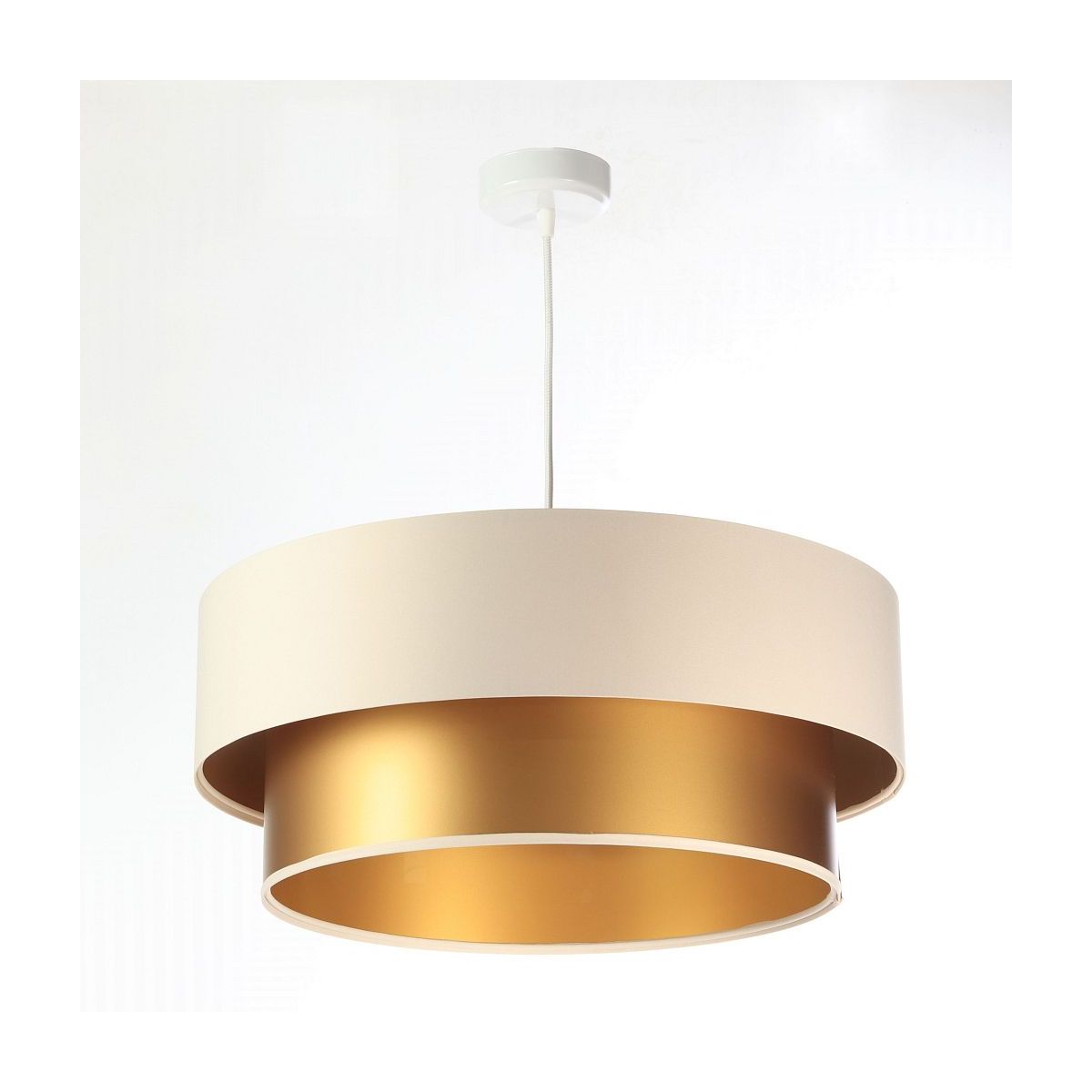 Die Lampe besteht aus PVC-Kunststoff, der mit einem glatten, cremefarbenen Satinstoff überzogen ist. Das Innere der Lampe besteht aus einer goldenen Fläche, die auf der einen Seite satinmatt und auf der anderen Seite glänzend ist, um den Leuchteffekt und den Glanz zu verstärken. Parameter der Fassung: 1 x E27 max. 60 W. Parameter der Deckenrosette: Kunststoff, Abmessungen 10 cm x 2 cm. Kabellänge: max. 80 cm, verstellbar. Kabelfarbe: weiß. LED-Glühbirnen können verwendet werden.