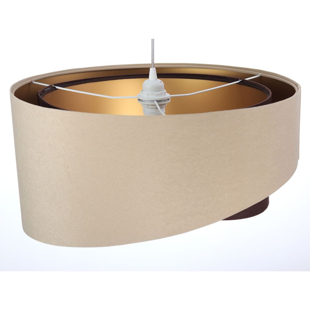 Lampenschirm aus Stoff (Mikrofaser) auf PVC-Kunststoff mit goldener Mitte. Parameter der Fassung: 1 x E27 max. 60 W. Parameter der Deckenrosette: Kunststoff, Abmessungen 10 cm x 2 cm. Kabellänge: max. 80 cm, verstellbar. Farbe des Kabels: transparent. LED-Glühbirnen können verwendet werden.