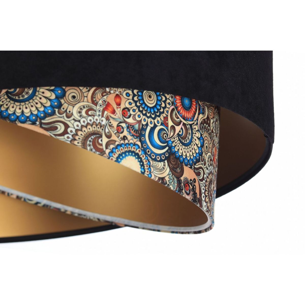 Lampenschirm aus Stoff (Mikrofaser) auf PVC-Kunststoff mit goldener Mitte. Parameter der Fassung: 1 x E27 max. 60 W. Parameter der Deckenrosette: Kunststoff, Maße 10 cm x 2 cm. Kabellänge: max. 80 cm, verstellbar. Farbe des Kabels: transparent. LED-Glühbirnen können verwendet werden.